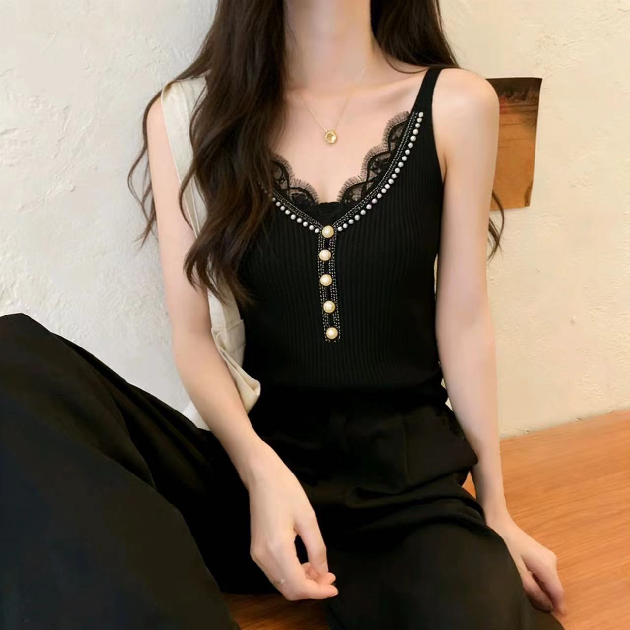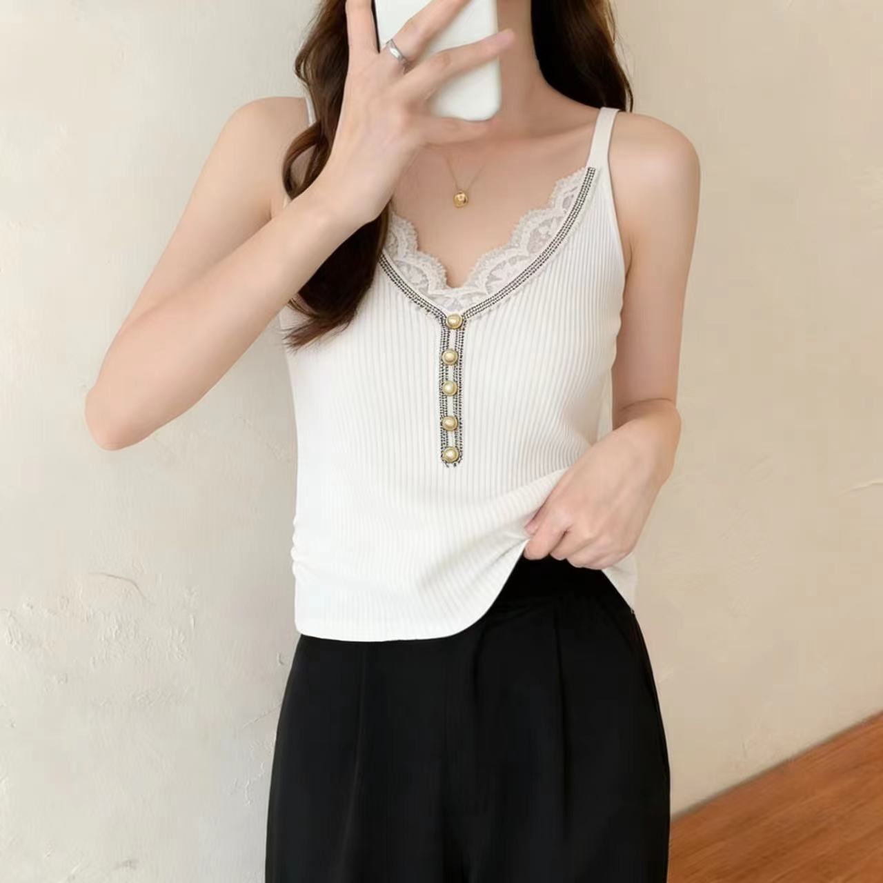 BY13824# 辣妹风蕾丝花边吊带背心女新款内搭外穿修身珍珠纽扣针织无袖上衣 服裝批發女裝批發服飾貨源