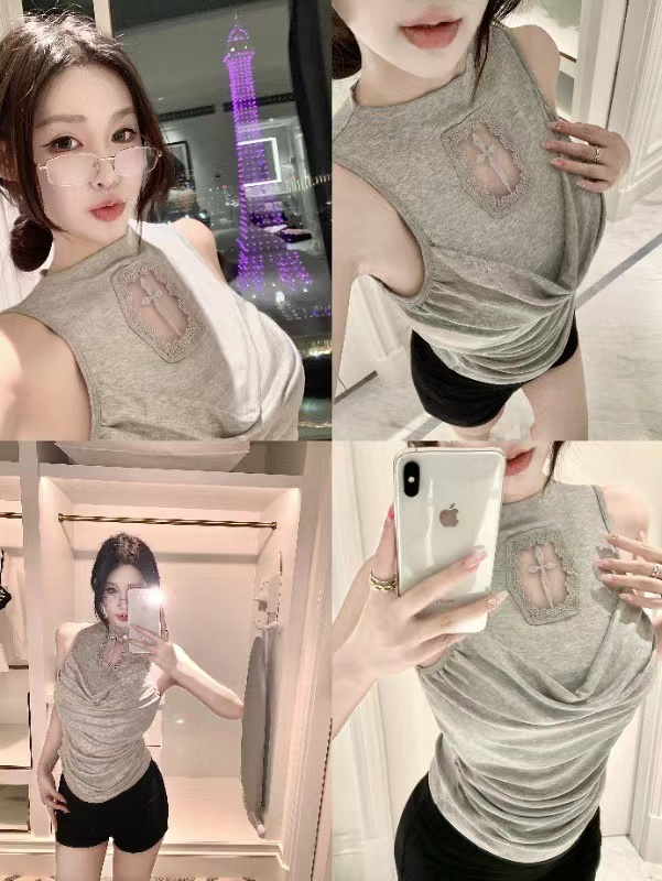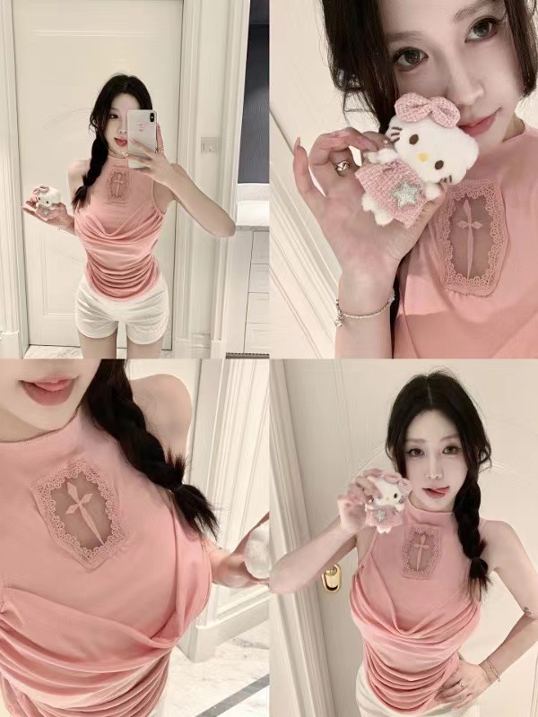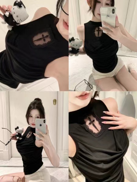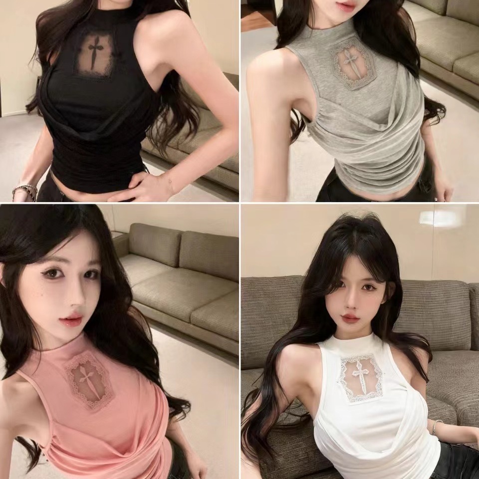 BY13825# 秋季辣妹风半高领拼接蕾丝网纱十字架背心固定带胸垫上衣女 服裝批發女裝批發服飾貨源