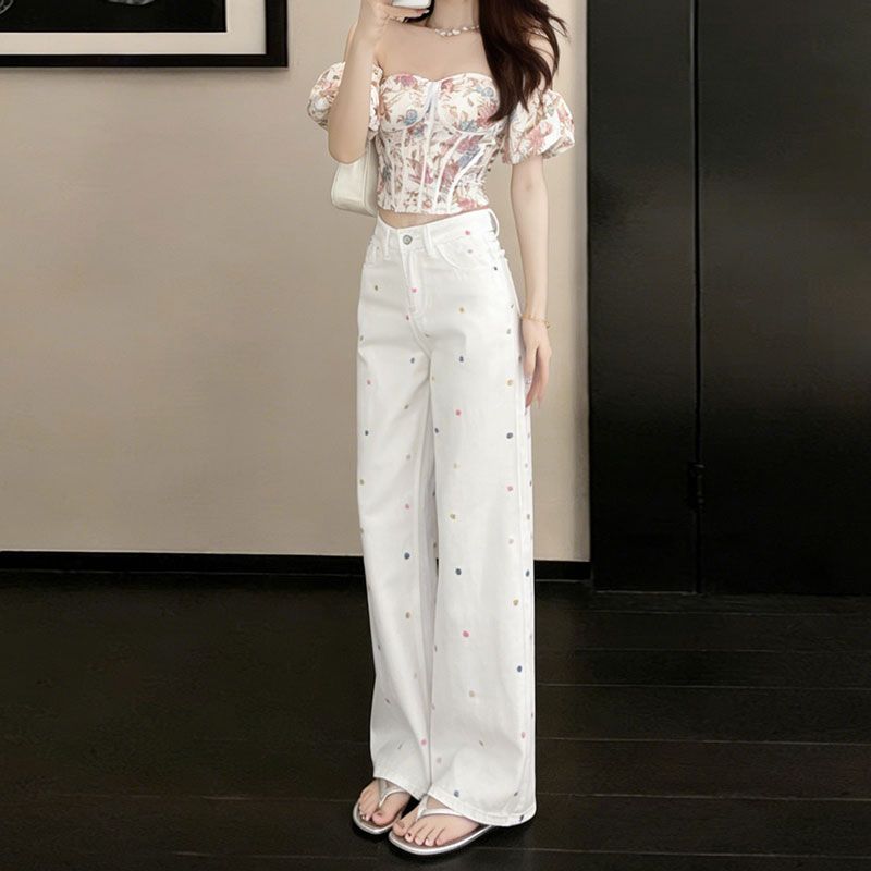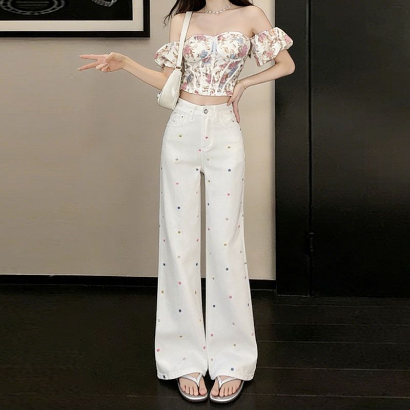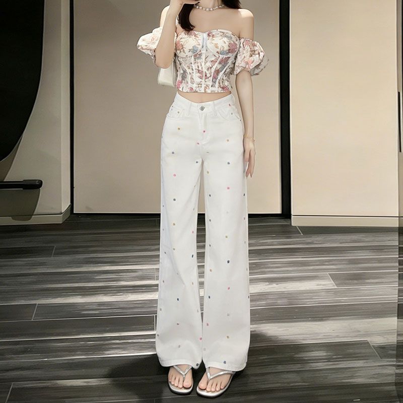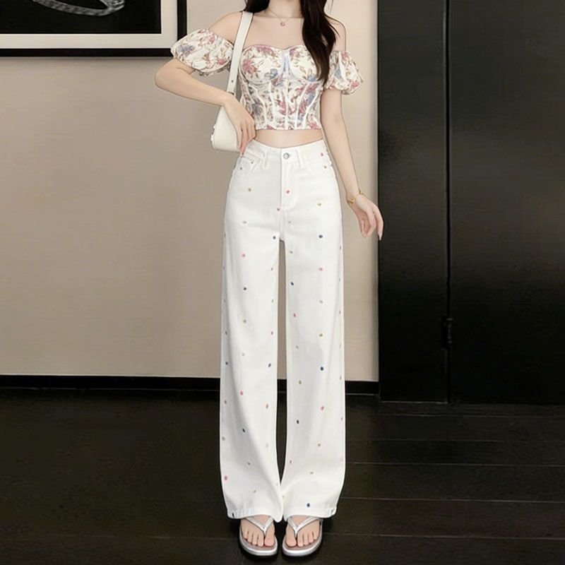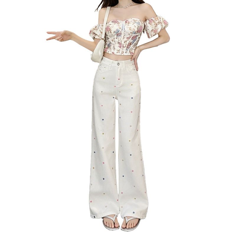 BY14654# 大码高腰阔腿牛仔裤女春夏新款显瘦设计感小花刺绣拖地直筒裤 服裝批發女裝批發服飾貨源