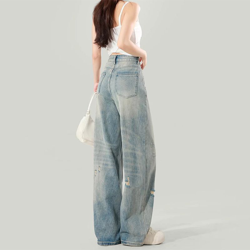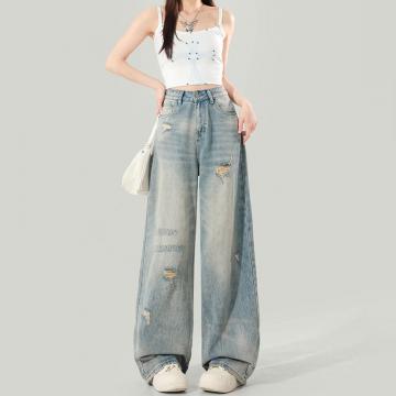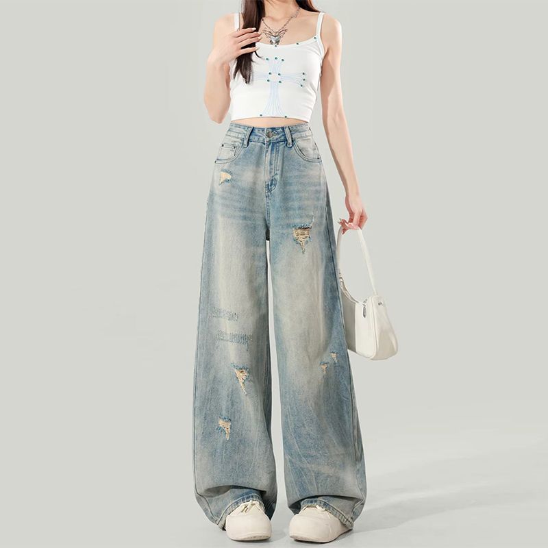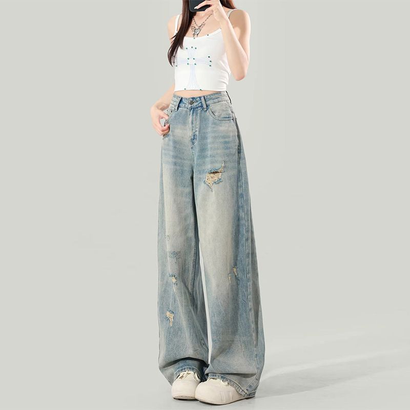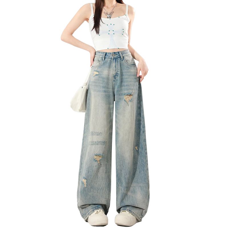 BY14655# 大码女装夏季美式破洞阔腿牛仔裤女宽松显瘦高腰直筒百搭拖地裤 服裝批發女裝批發服飾貨源