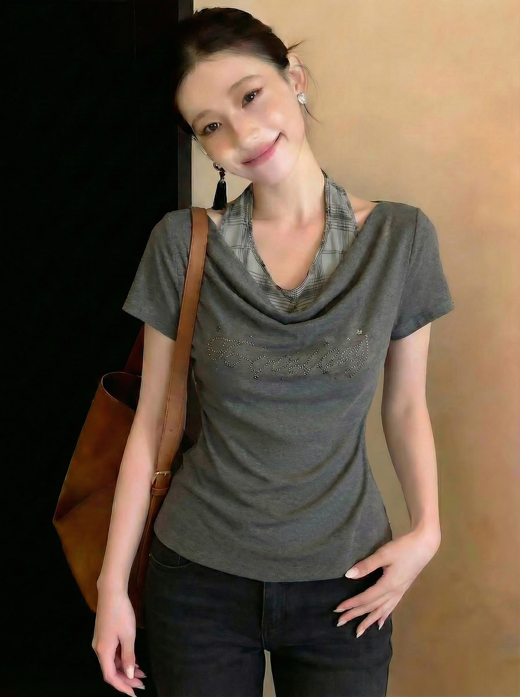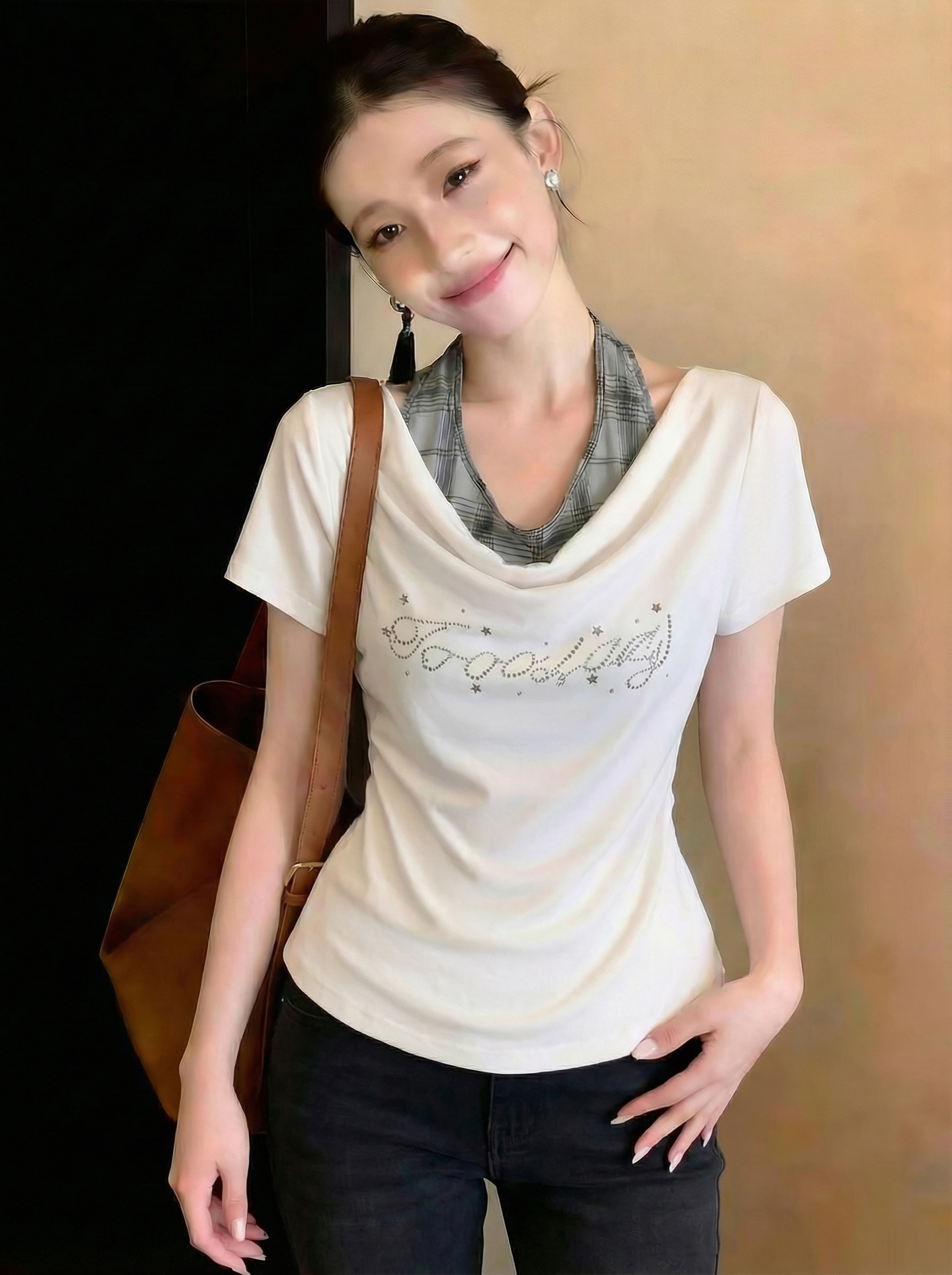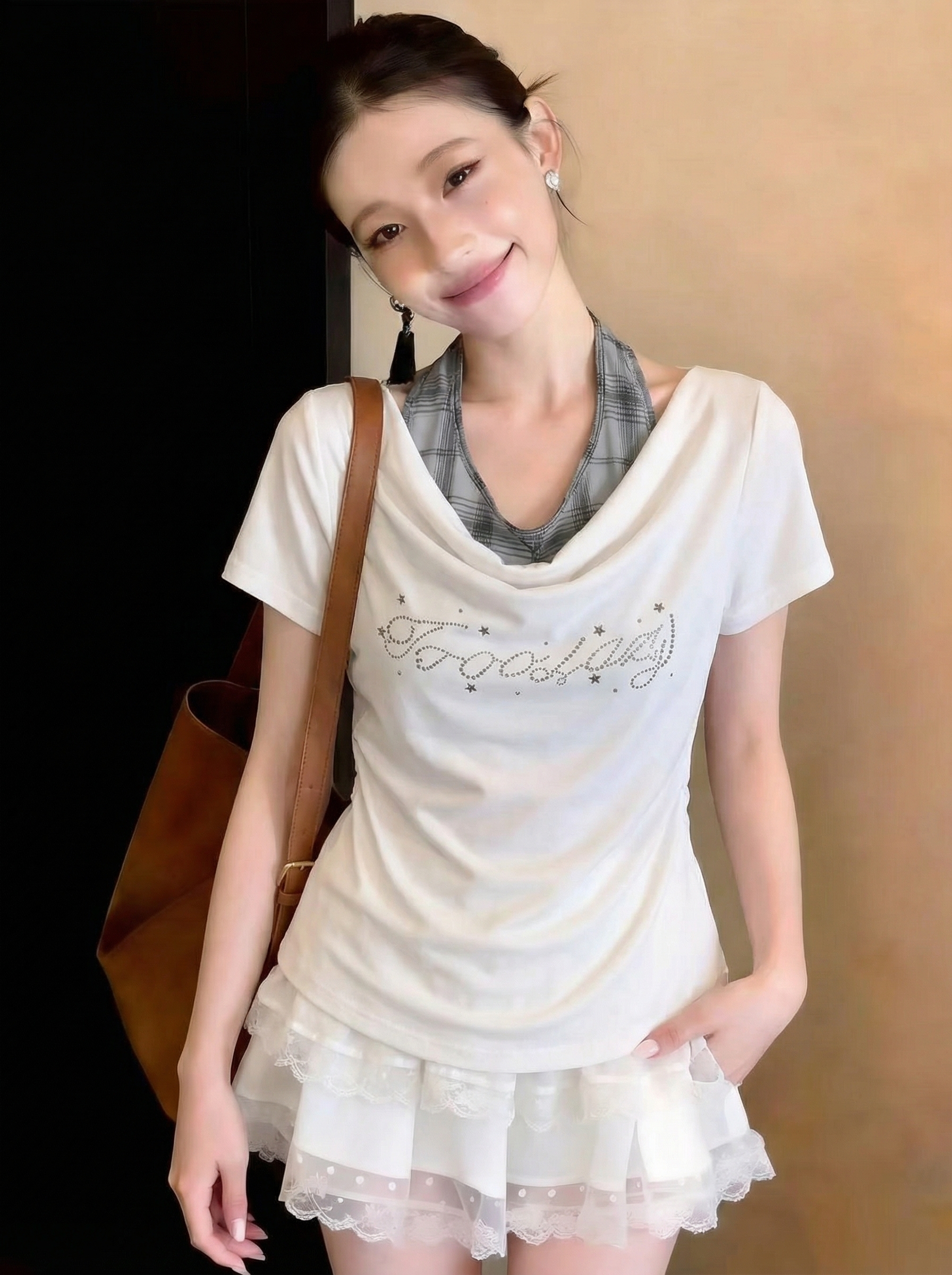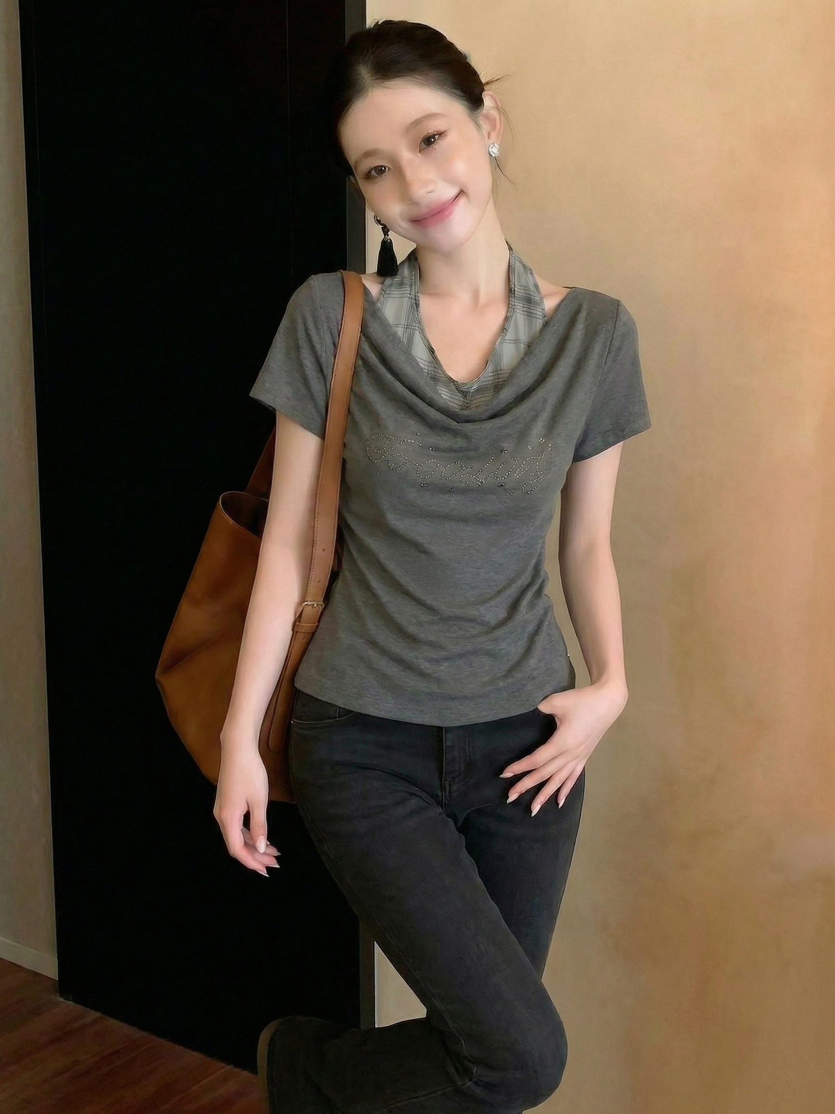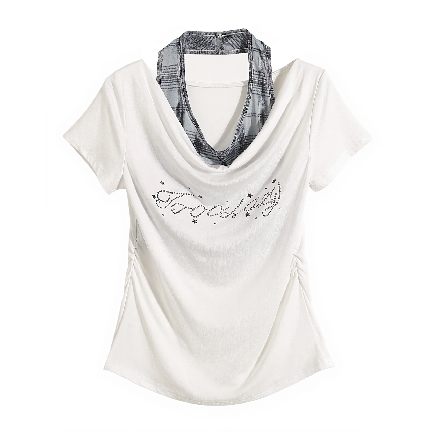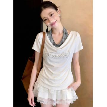 BY14676# 美式辣妹假两件挂脖拼接短袖T恤女春季褶皱收腰修身显瘦上衣 服裝批發女裝批發服飾貨源