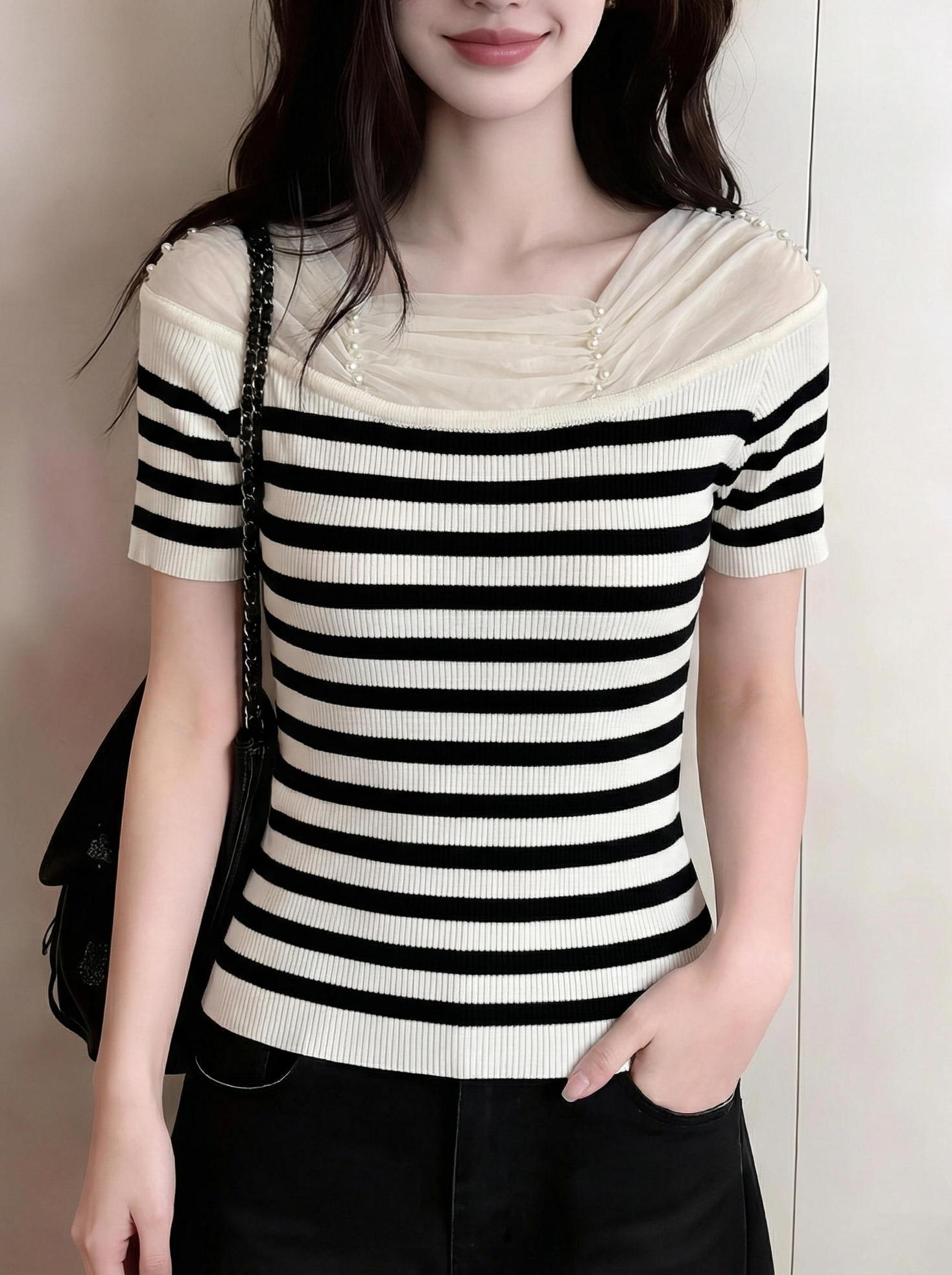 BY14681# ~绝美好看蕾丝花边短袖针织t恤女夏季新款修身气质甜辣上衣 服裝批發女裝批發服飾貨源