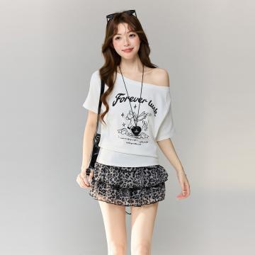 BY15585# 白色慵懒风斜肩短袖T恤女夏季字母印花辣妹露肩宽松上衣 服裝批發女裝批發服飾貨源