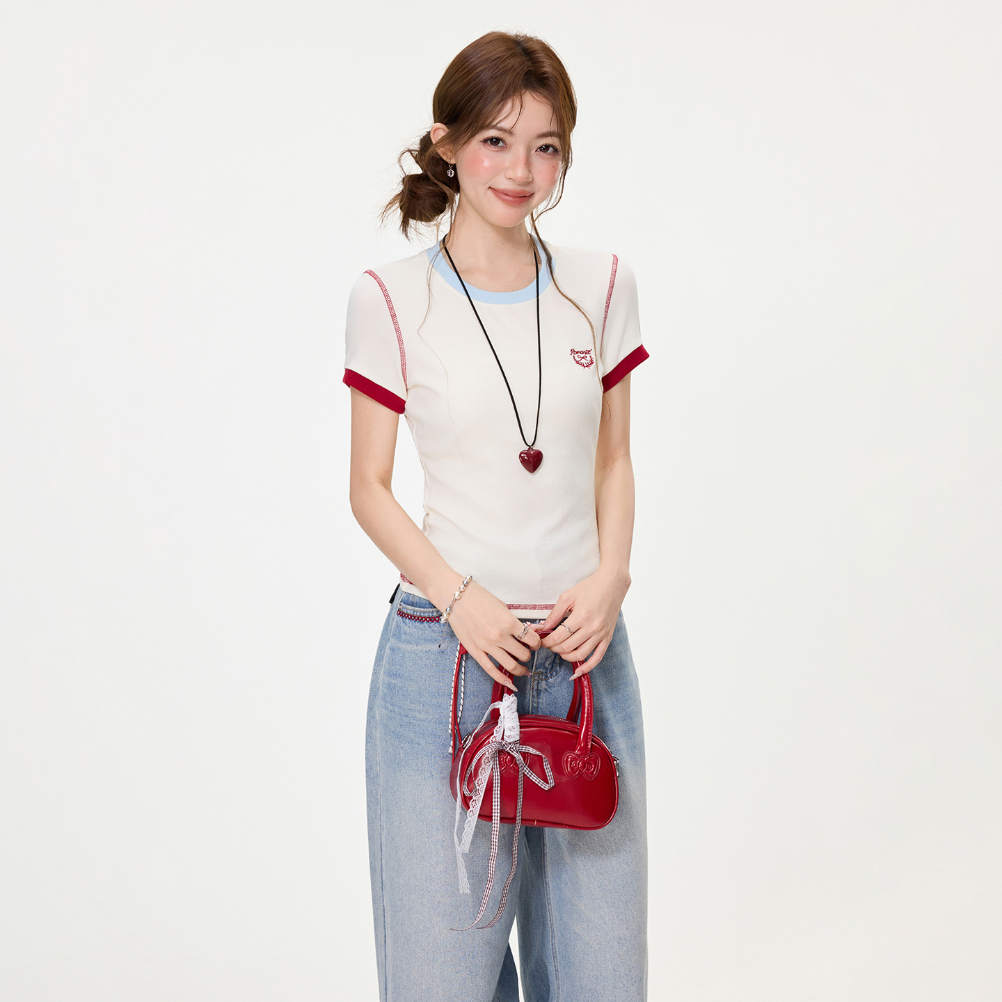 BY15595# 韩系撞色刺绣正肩短袖t恤女夏修身显瘦短款减龄上衣 服裝批發女裝批發服飾貨源