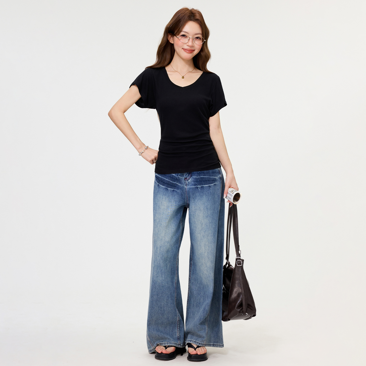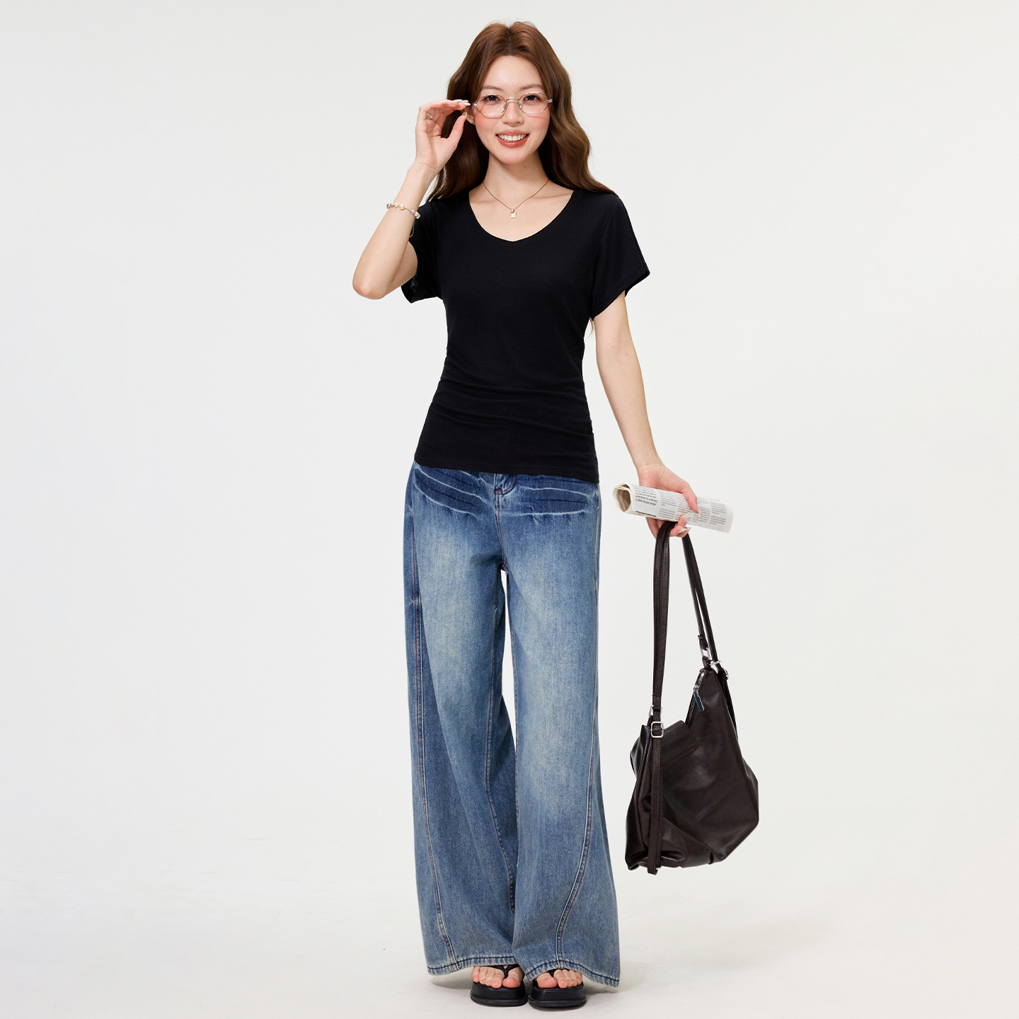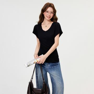 BY15599# 纯欲黑色莱赛尔V领短袖T恤女夏季正肩基础款收腰气质上衣 服裝批發女裝批發服飾貨源