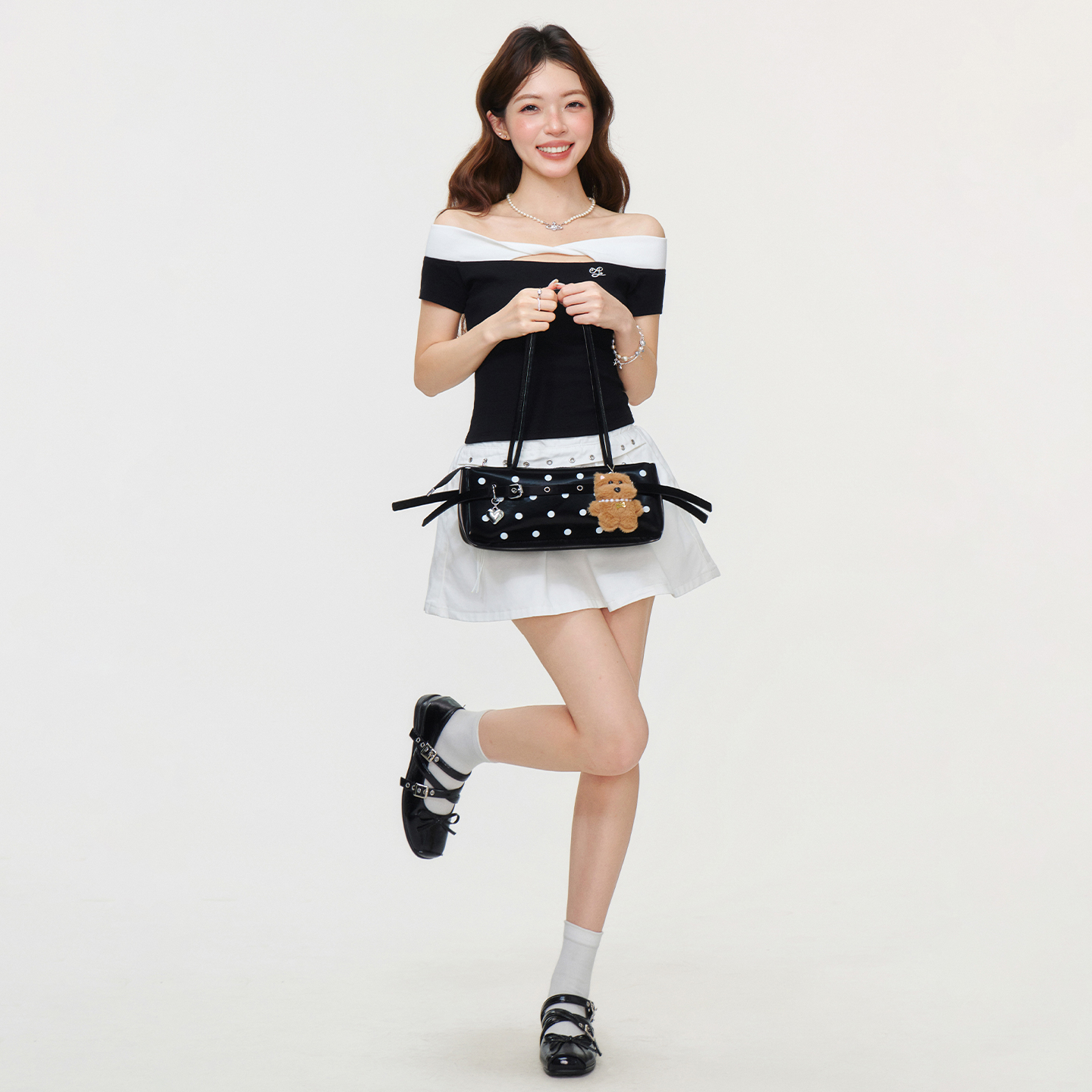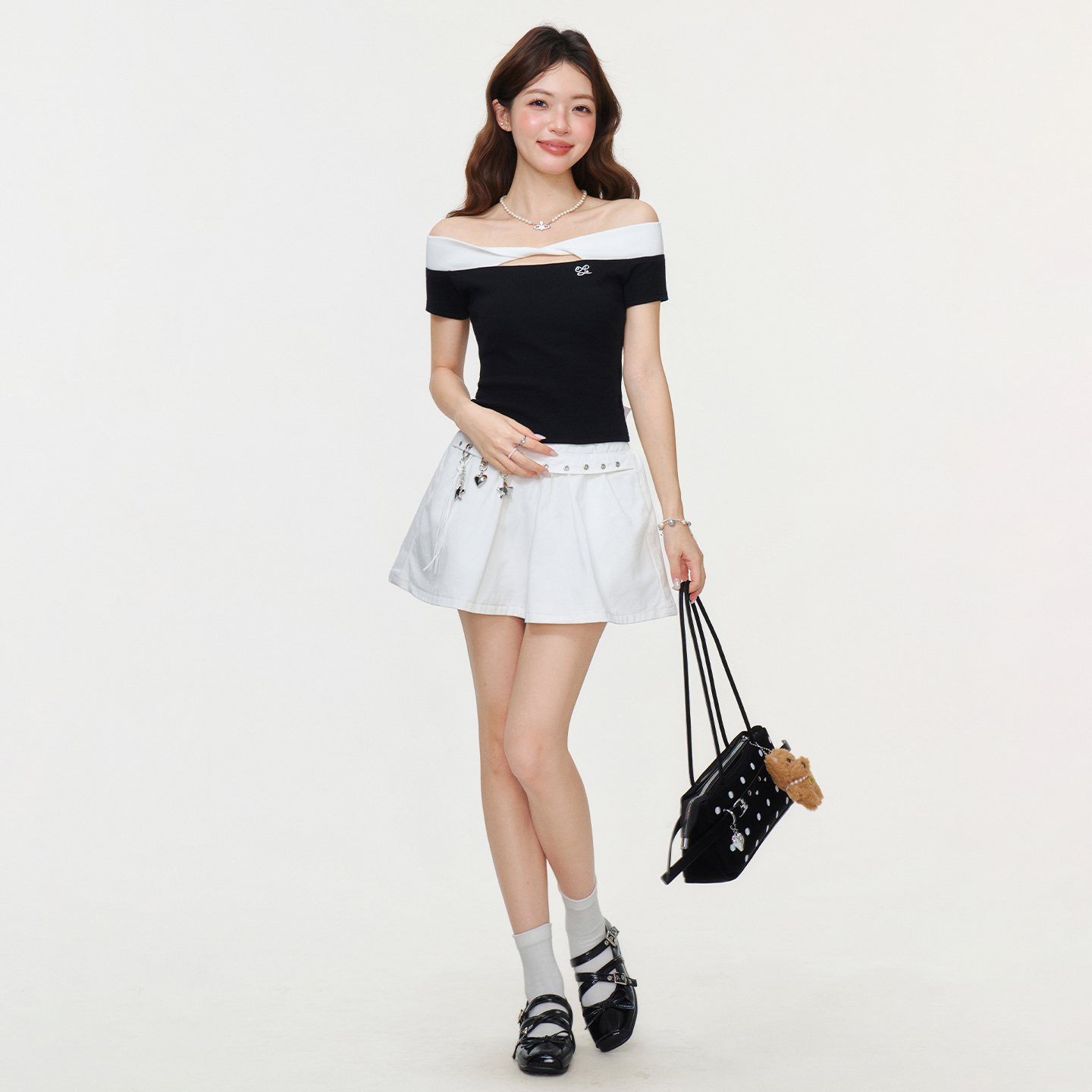 BY15600# 一字肩撞色短袖蝴蝶扭结掐腰镂空上衣气质显瘦收腰T恤女 服裝批發女裝批發服飾貨源