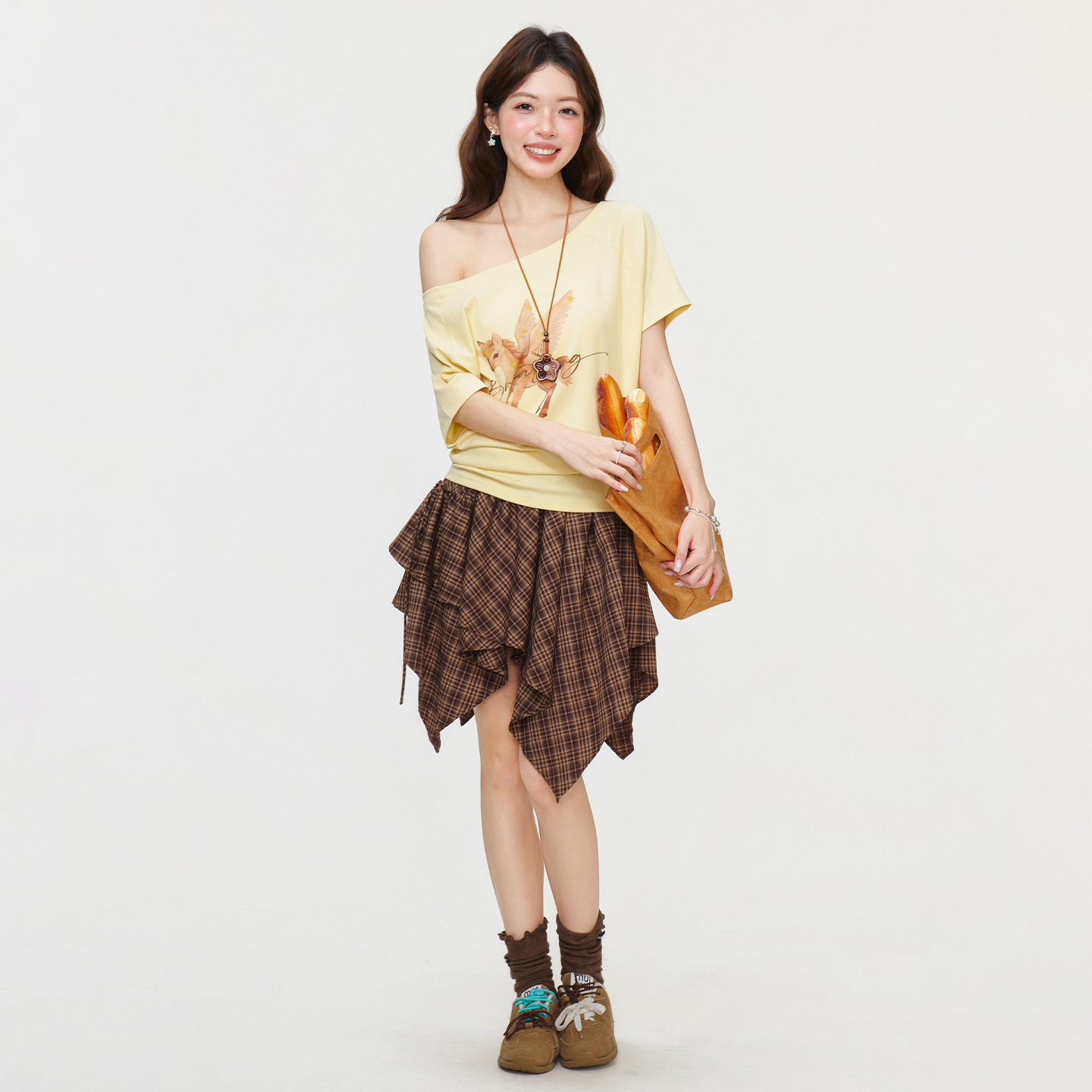 BY15601# 奶黄斜肩露肩印花短袖T恤女夏季辣妹一字肩宽松显瘦上衣 服裝批發女裝批發服飾貨源