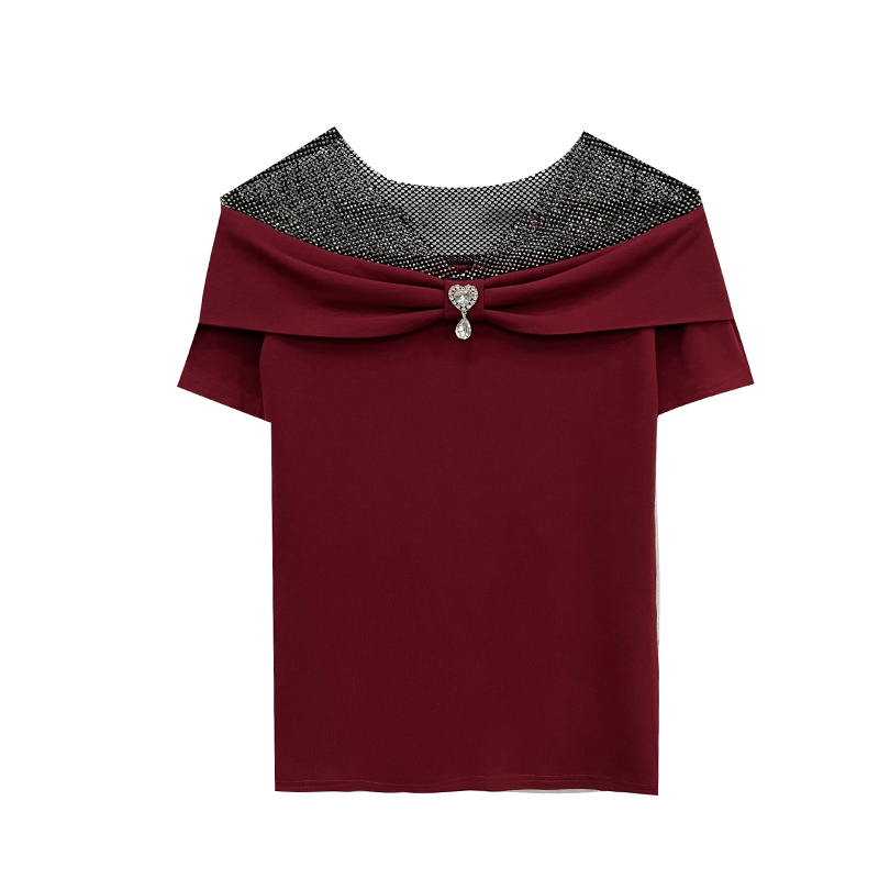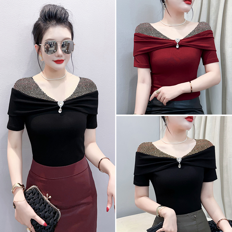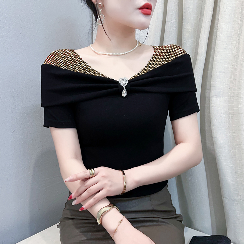 BY15602# 性感一字肩个性镶钻拼接短袖T恤女夏新款修身气质减龄V领上衣 服裝批發女裝批發服飾貨源