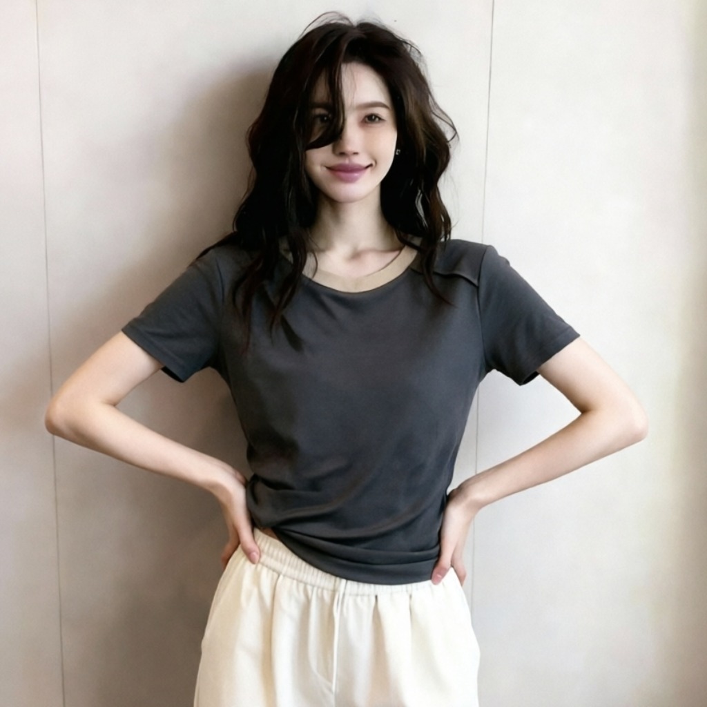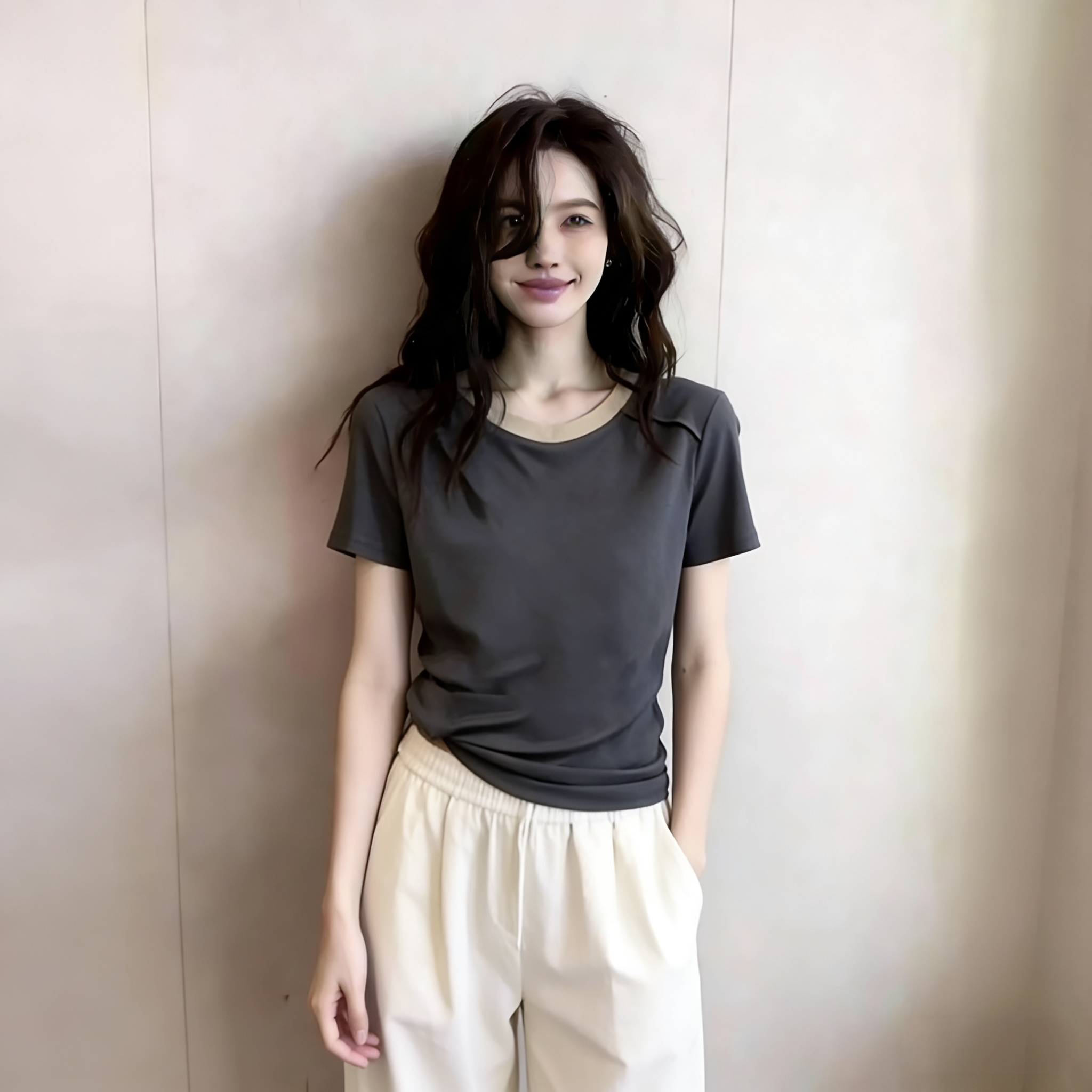 BY15633# 夏季新款撞色圆领拼接正肩设计修身显瘦短袖T恤上衣女 服裝批發女裝批發服飾貨源