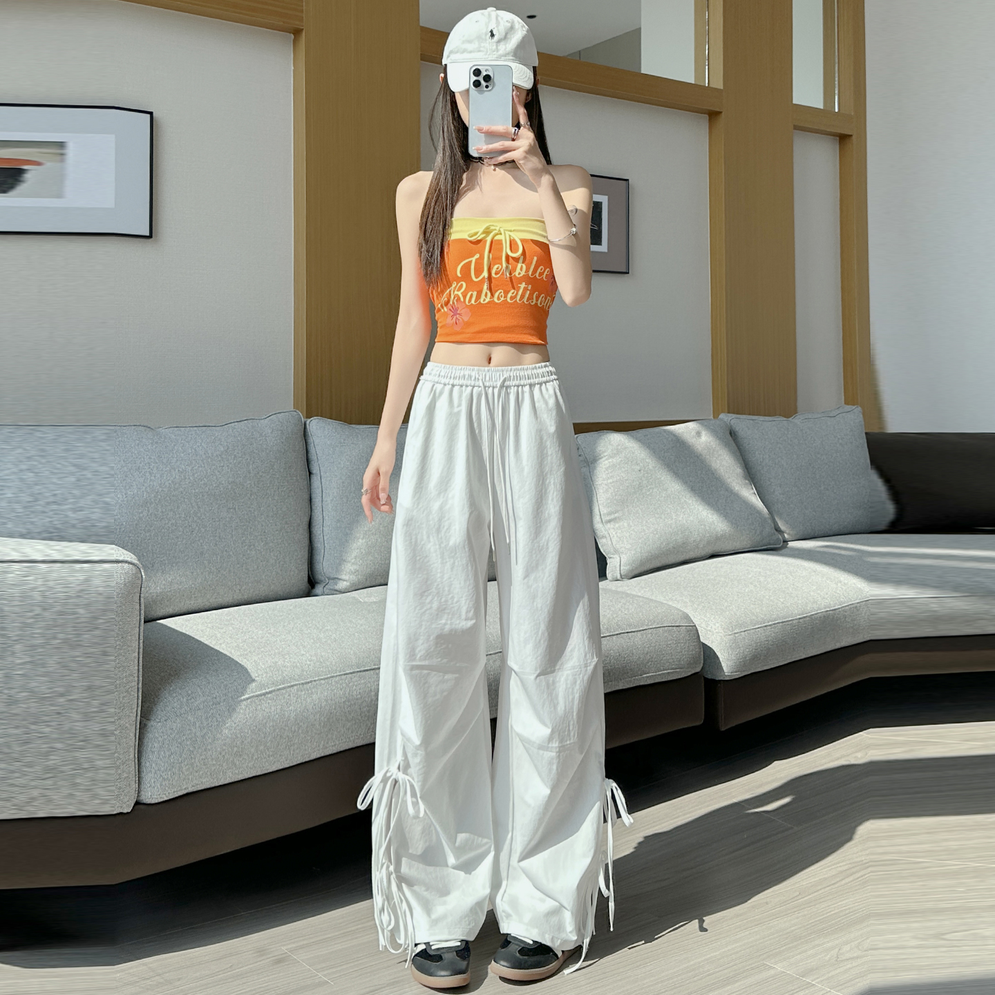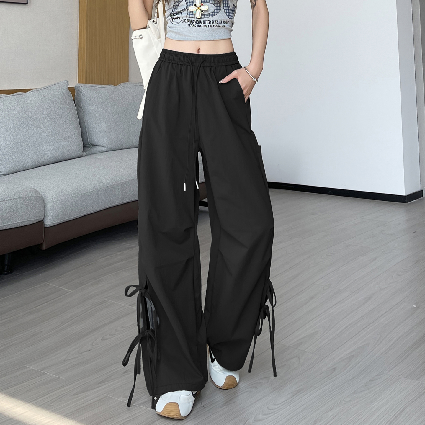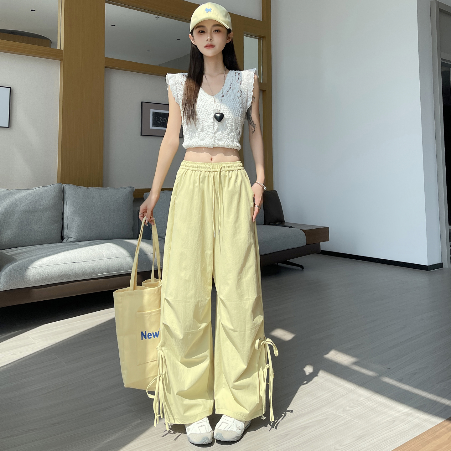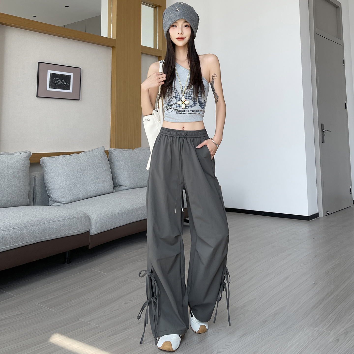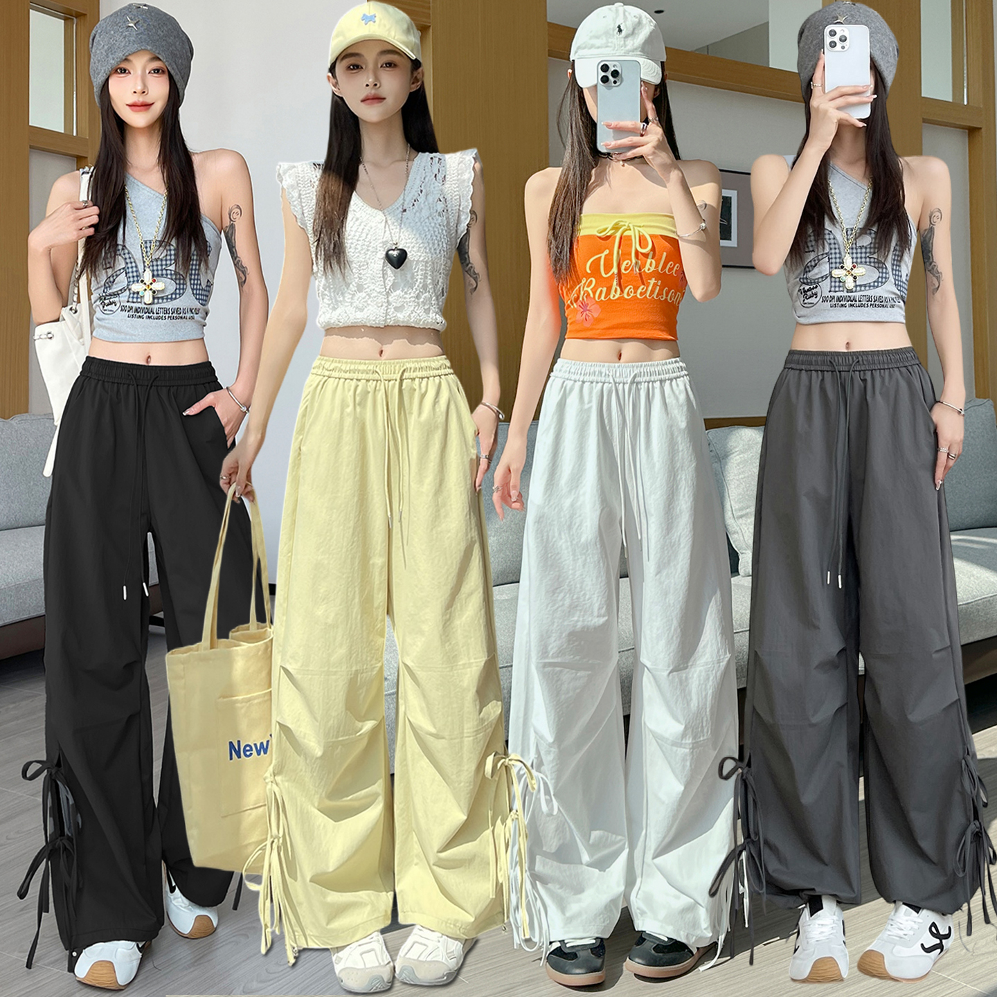 BY18093# 休闲裤女夏季新款美式复古绑带镂空高腰直筒工装裤 服裝批發女裝批發服飾貨源