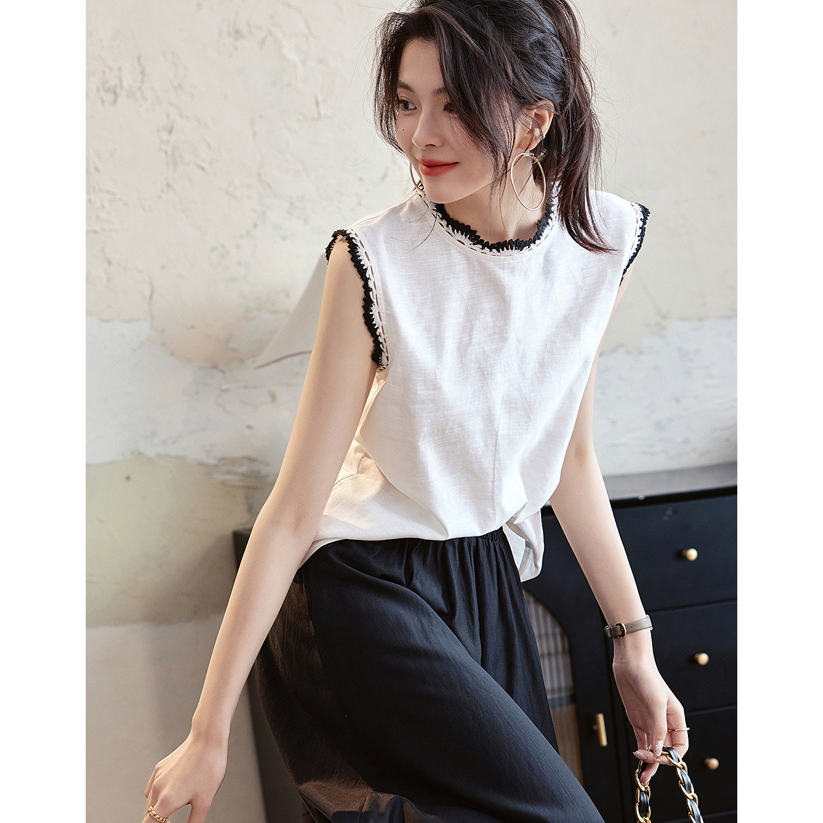 BY18115# 夏季文清爽亚麻棉竹节布艺衬衫立领无袖撞色花边衬衣女装上衣 服裝批發女裝批發服飾貨源