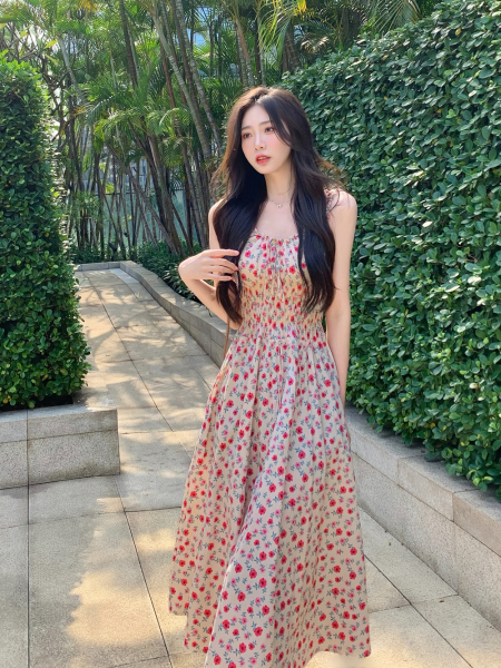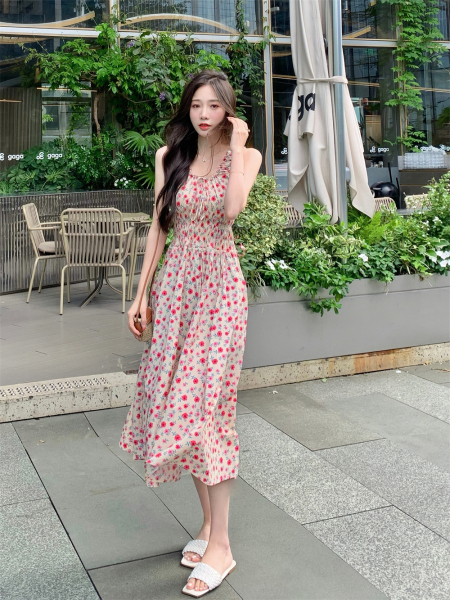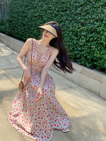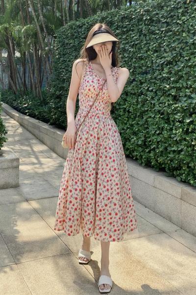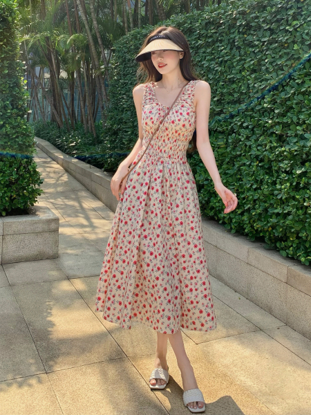 TR24424# 胖mm法式V领无袖系带收腰显瘦褶皱碎花裙背心吊带连衣裙 服装批发女装服饰直播货源