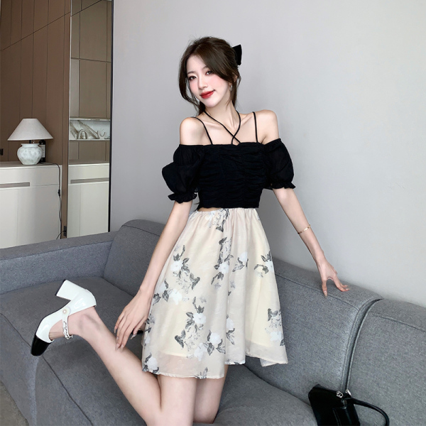 TR32916# 法式设计感露腰连衣裙新款温柔系甜辣挂脖拼接高腰连衣裙 服装批发女装批发服饰货源