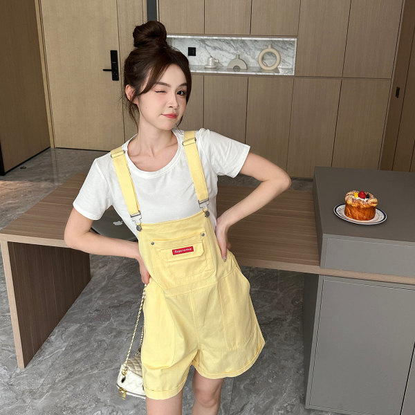 黄色背带裤 白色T恤