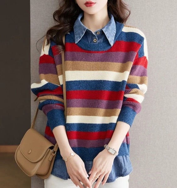 TR51355# 早春新款春款百搭韩系针织衫女春秋款衬衫假两件上衣毛衣 服装批发女装批发服饰货源