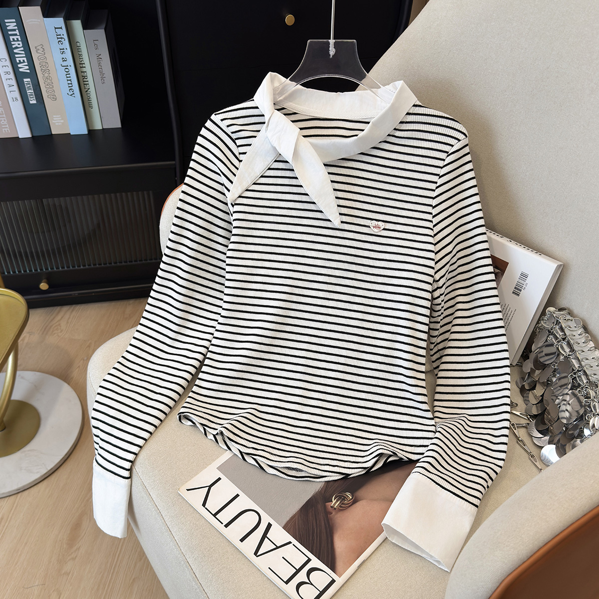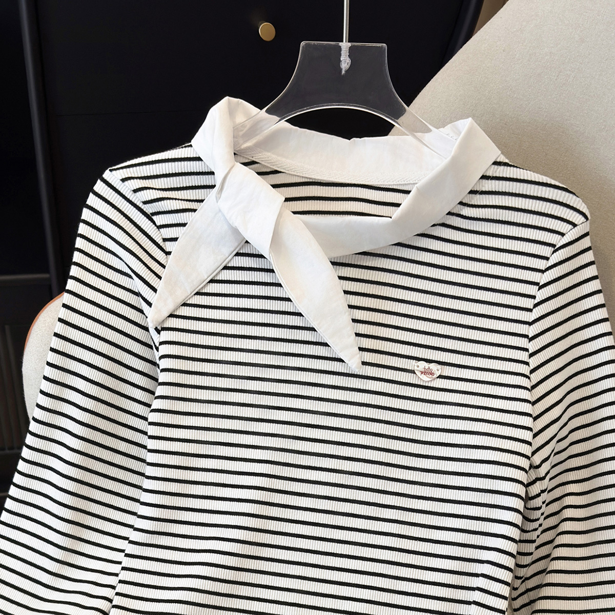 FA40400# 条纹ins领结修身长袖T恤女韩系早秋穿搭假两件内搭打底衫上衣 服裝批發女裝批發服飾貨源