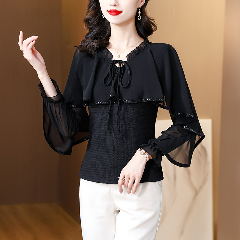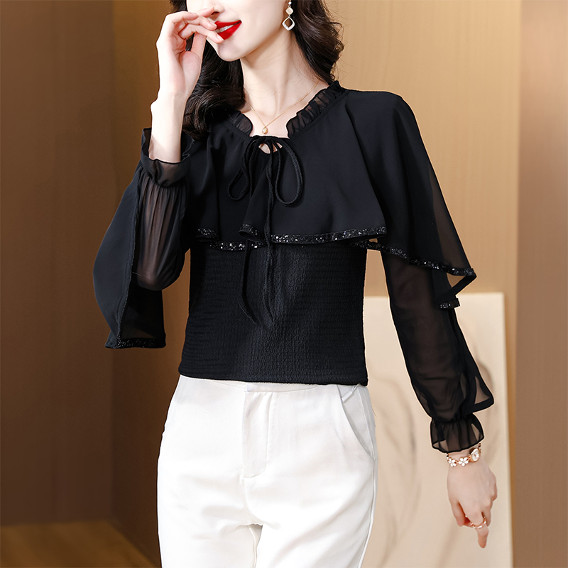 FA43069# 早秋新款法式复古斗篷重工亮片时尚显瘦气质修身雪纺上衣 服裝批發女裝批發服飾貨源