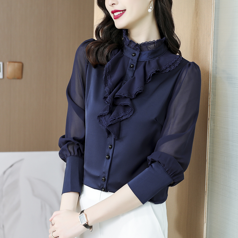 Home > 长袖雪纺衫、衬衫、上衣 > FA43070# 新款花边领子泡泡袖衬衫设计感小众荷叶边修身上衣女 服裝批發女裝批發服飾貨源