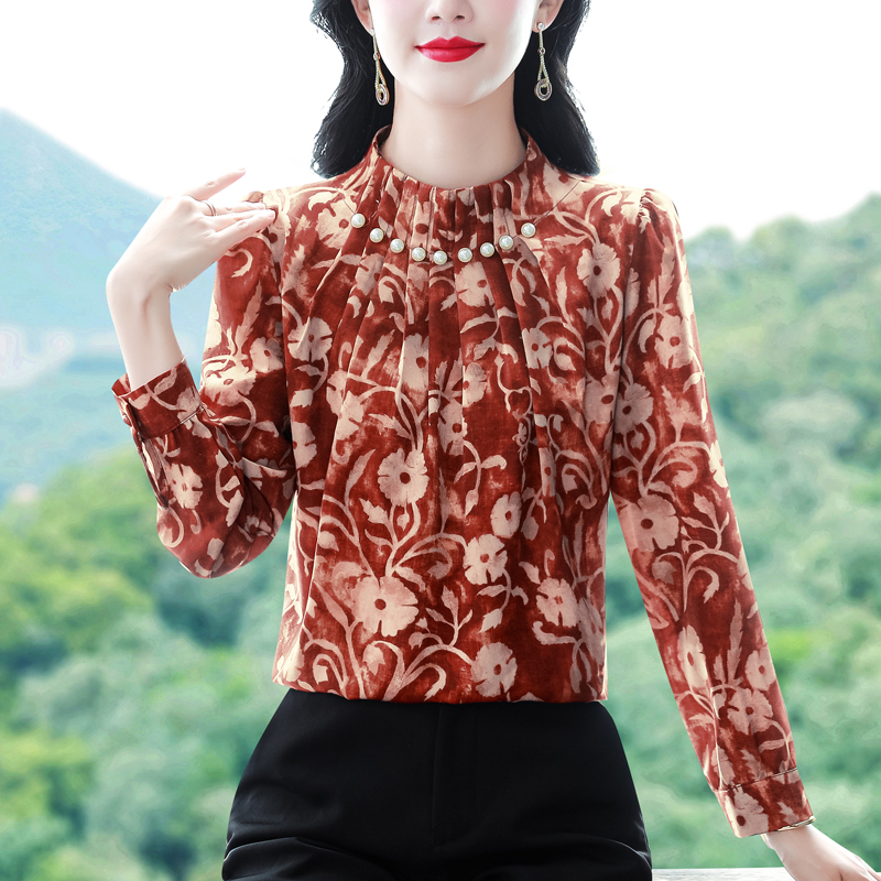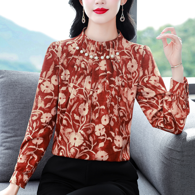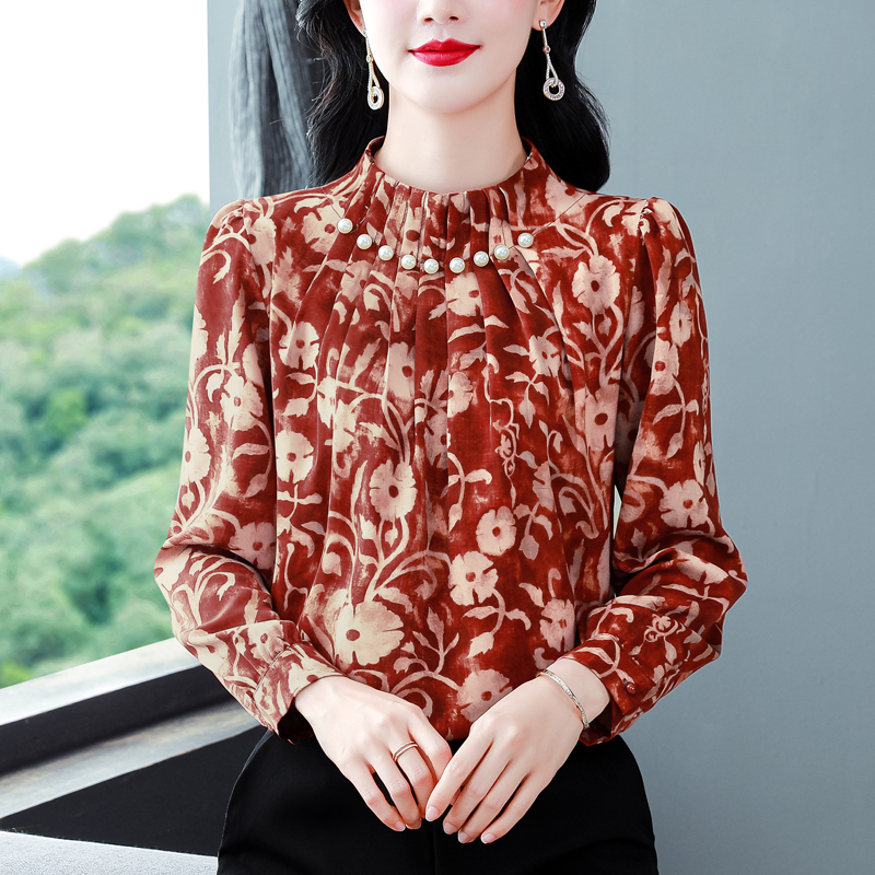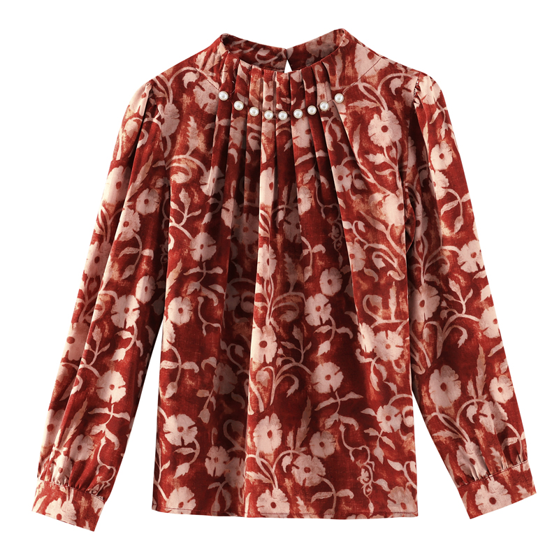 FA43074# 秋装新款缎面立领钉珠印花长袖雪纺衬衫女春秋洋气衬衣 服裝批發女裝批發服飾貨源