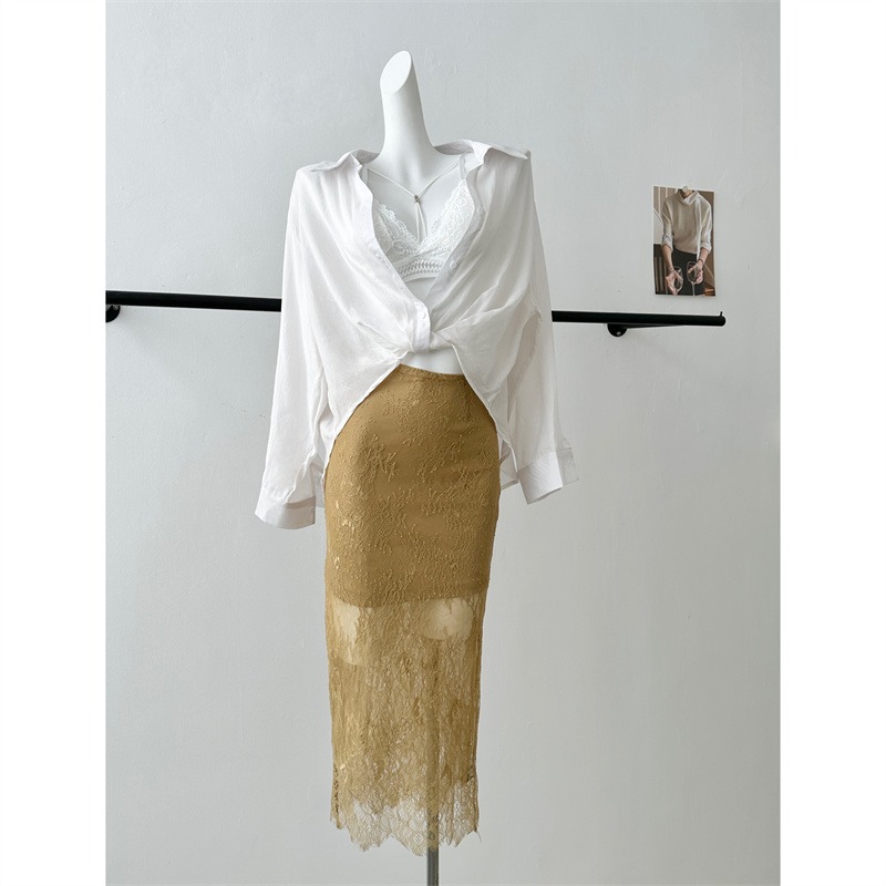 FA43077# 秋上新设计感扭结长袖衬衫+抹胸吊带+卡其蕾丝半身裙三件套装女 服裝批發女裝批發服飾貨源