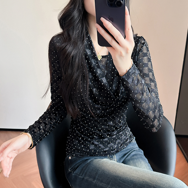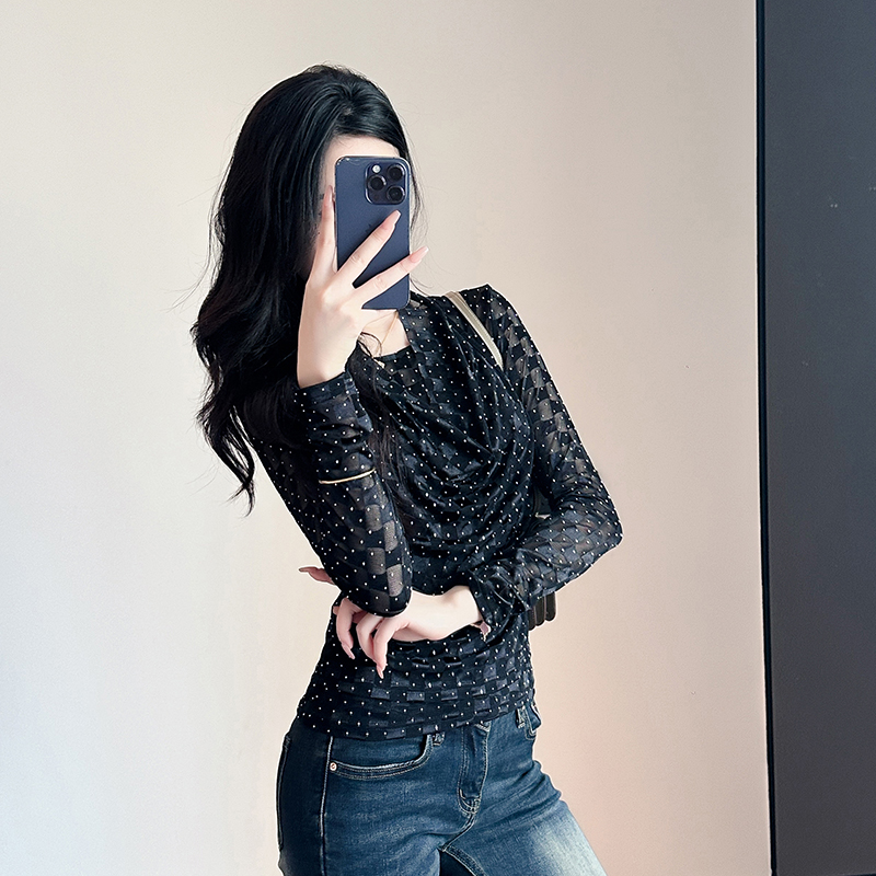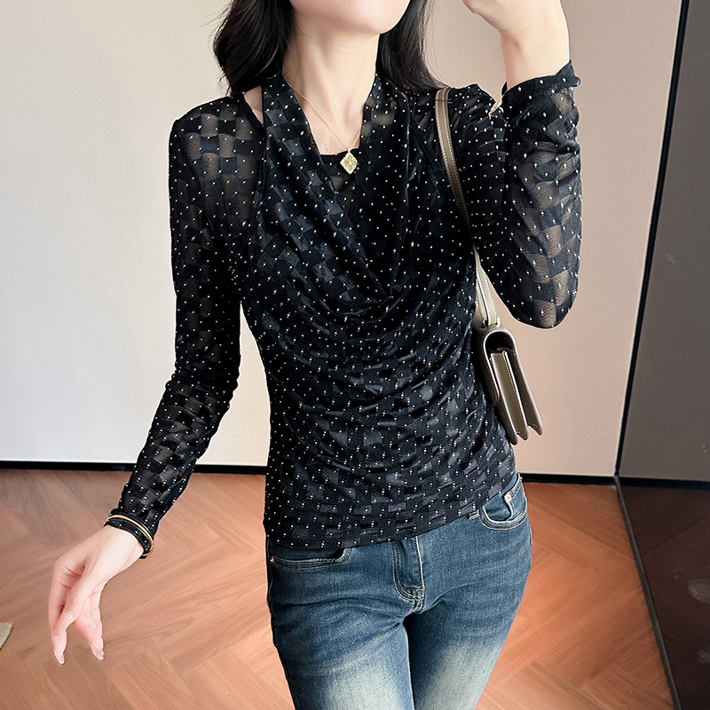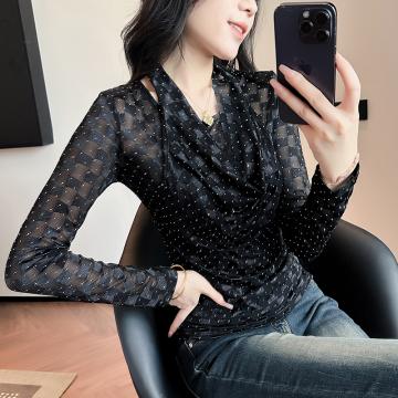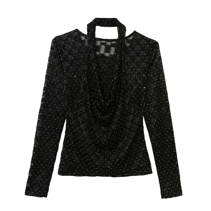 FA43080# 秋冬新款设计感网纱烫钻挂脖领时尚修身显瘦长袖T恤打底衫上衣女 服裝批發女裝批發服飾貨源
