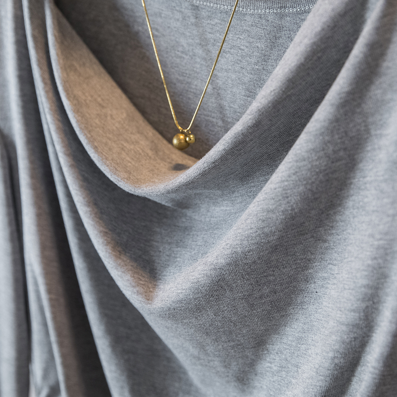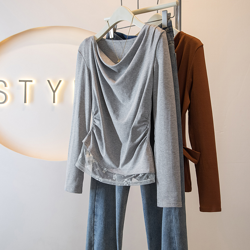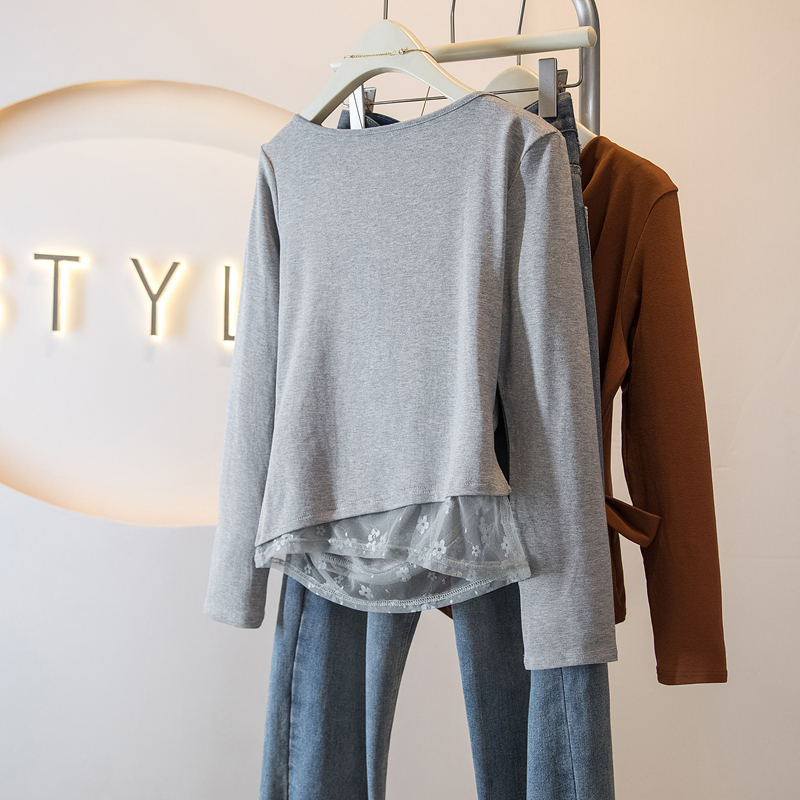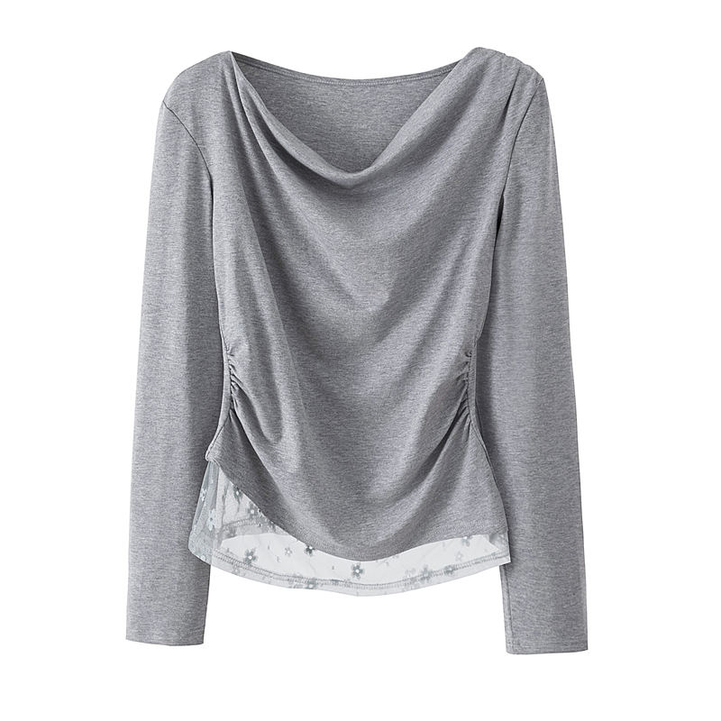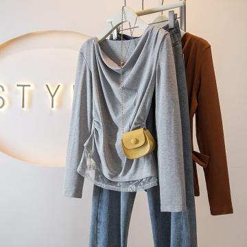 FA43083# 秋季新款韩系少女感不规则打底上衣荡领蕾丝收腰长袖T恤 服裝批發女裝批發服飾貨源
