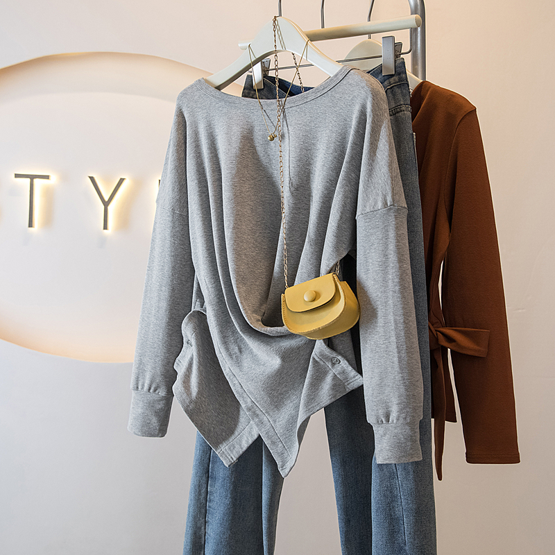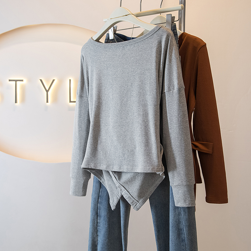 FA43085# 灰色不规则正肩长袖针织衫女秋季高级感收腰打底衫毛衣蝙蝠袖上衣 服裝批發女裝批發服飾貨源
