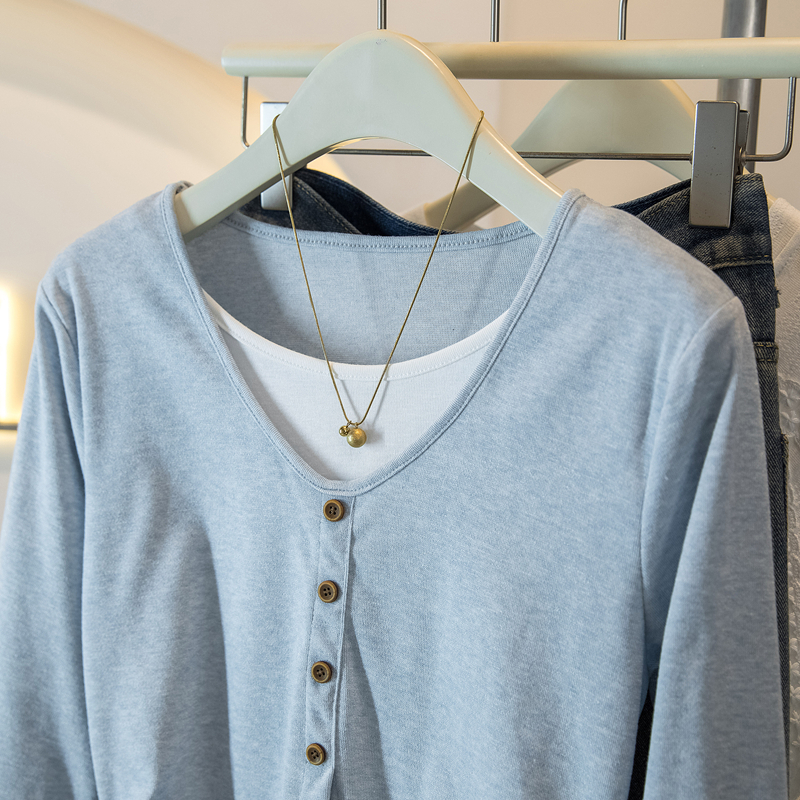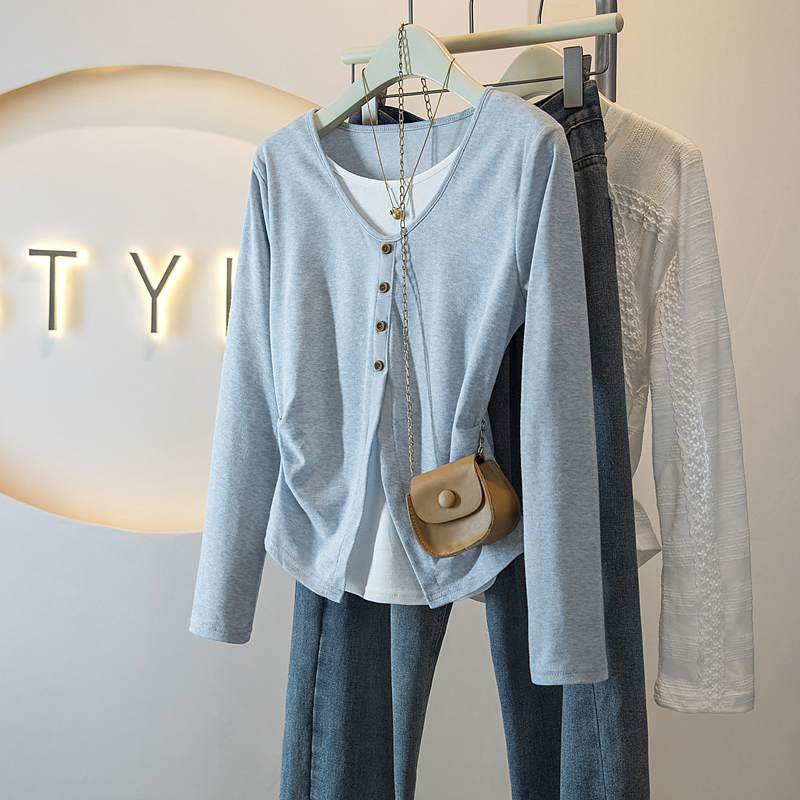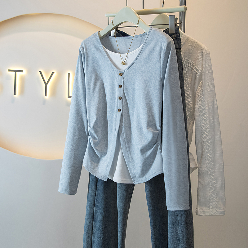 FA43090# 秋季新款蓝色假两件长袖T恤女春秋不规则收腰正肩体恤短上衣 服裝批發女裝批發服飾貨源