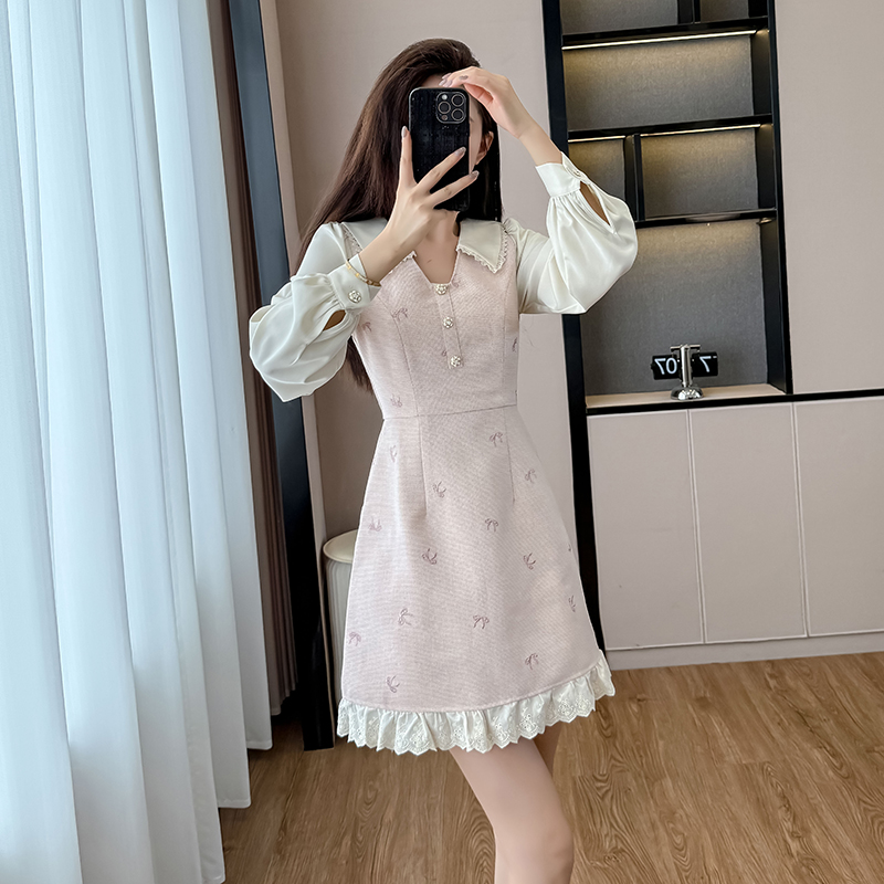 FA43096# 小香风粉色甜美长袖连衣裙秋冬高级感拼接蕾丝显瘦a字裙 服裝批發女裝批發服飾貨源