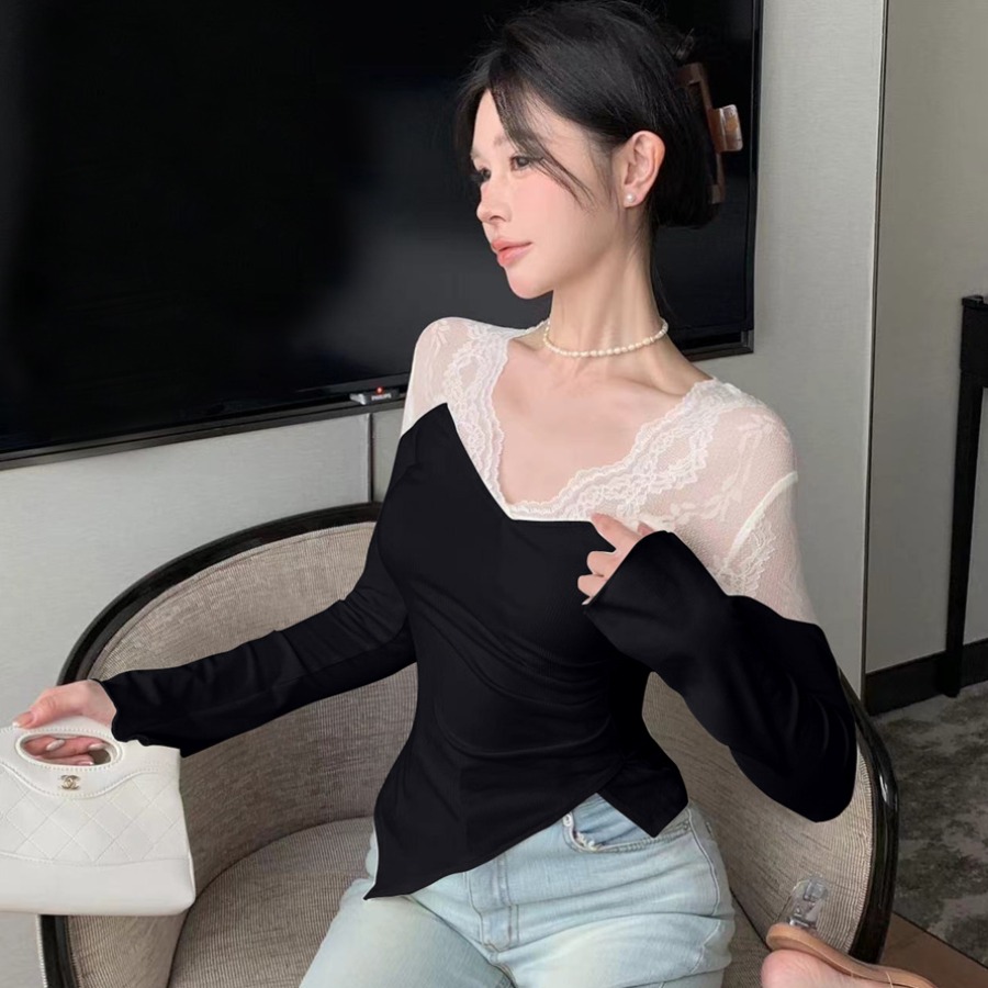 FA43104# 纯欲性感甜美辣妹V领蕾丝长袖T恤女打底衫紧身短款V领不规则上衣 服裝批發女裝批發服飾貨源