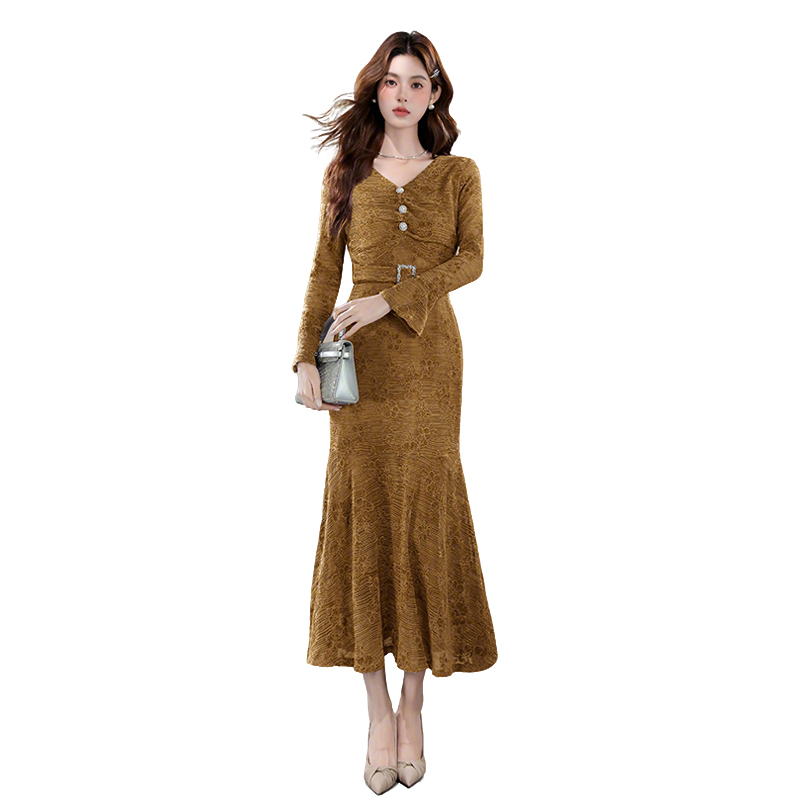 FA43116# 品质法式复古长裙高端气质V领长袖修身鱼尾蕾丝连衣裙 服裝批發女裝批發服飾貨源