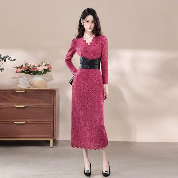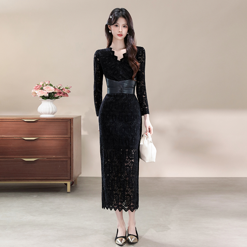 FA43123# 品质性感纯欲V领绑带长袖连衣裙显瘦蕾丝包臀辣妹长裙 服裝批發女裝批發服飾貨源