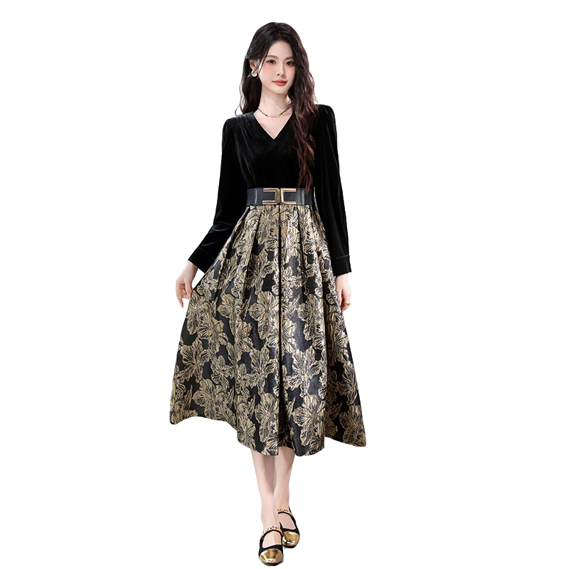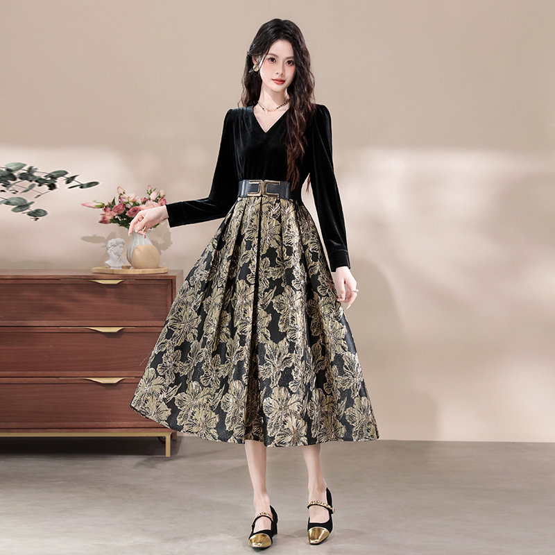 FA43124# 品质海青蓝金丝绒提花连衣裙复古高级感收腰假两件裙子 服裝批發女裝批發服飾貨源