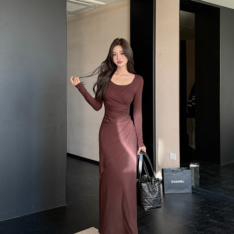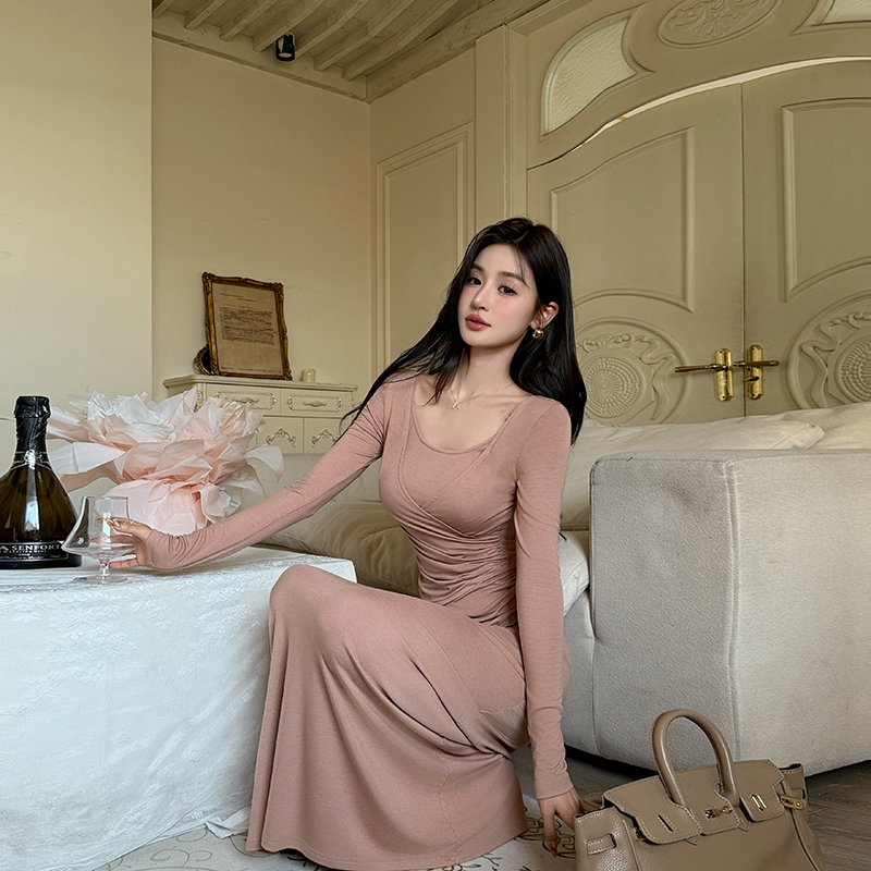 FA43126# 艺术白月光气质收腰长款褶皱A字连衣裙秋冬内搭打底裙子 服裝批發女裝批發服飾貨源