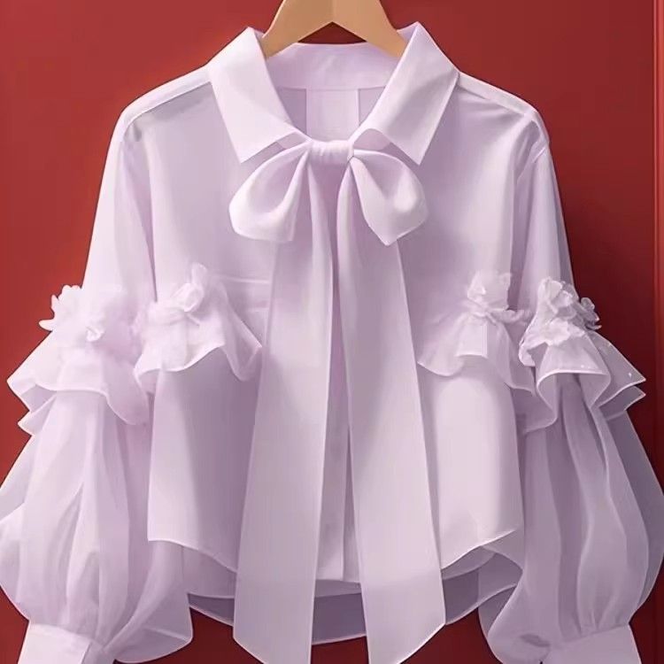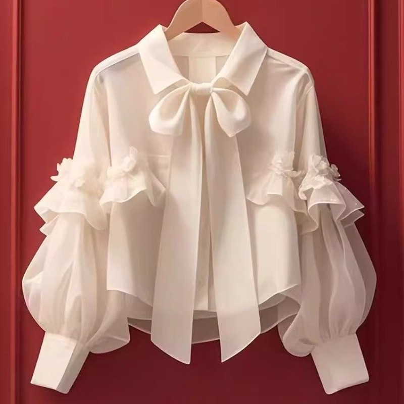 LN76314# 早春新款荷叶边上衣女高级感法式独特漂亮绿色蝴蝶结长袖衬衫