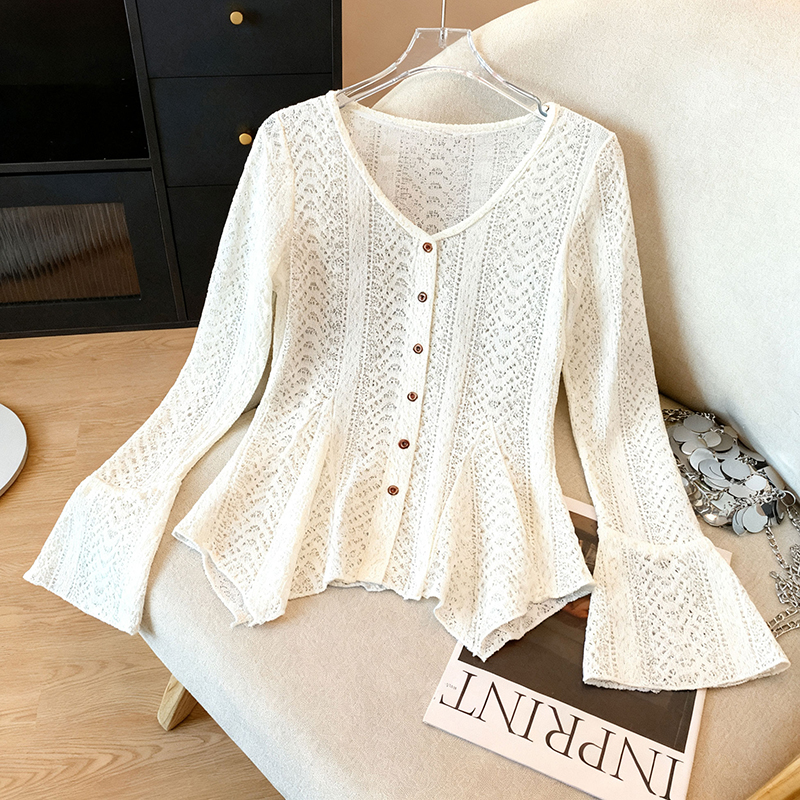 FA43332# 法式杏色V领长袖针织衫女秋季新款设计感喇叭袖收腰上衣 服裝批發女裝批發服飾貨源