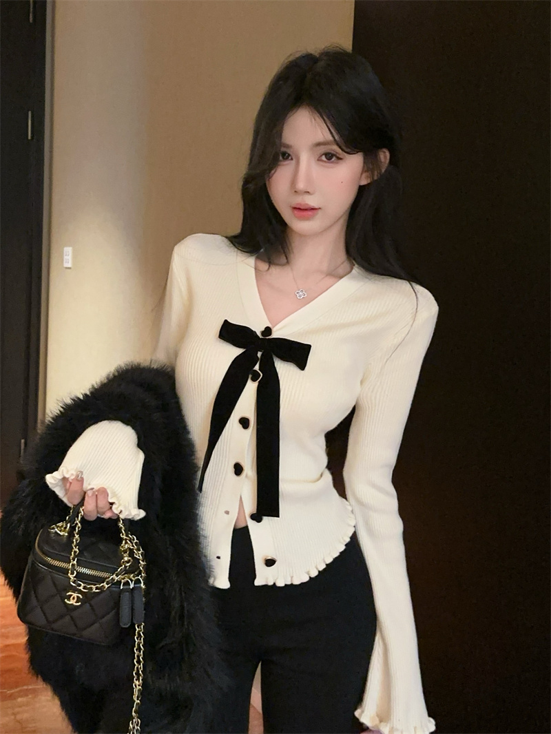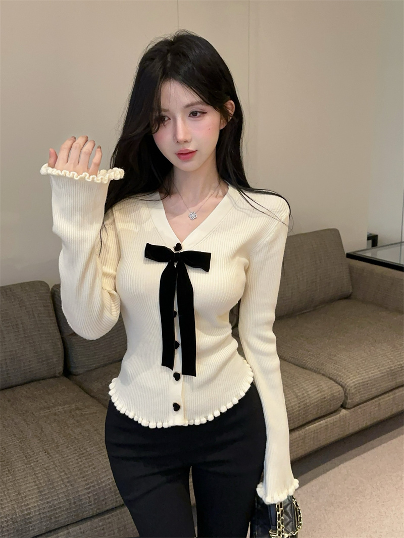 FA43357# 甜美法式蝴蝶结爱心扣V领修身针织衫上衣 服裝批發女裝批發服飾貨源