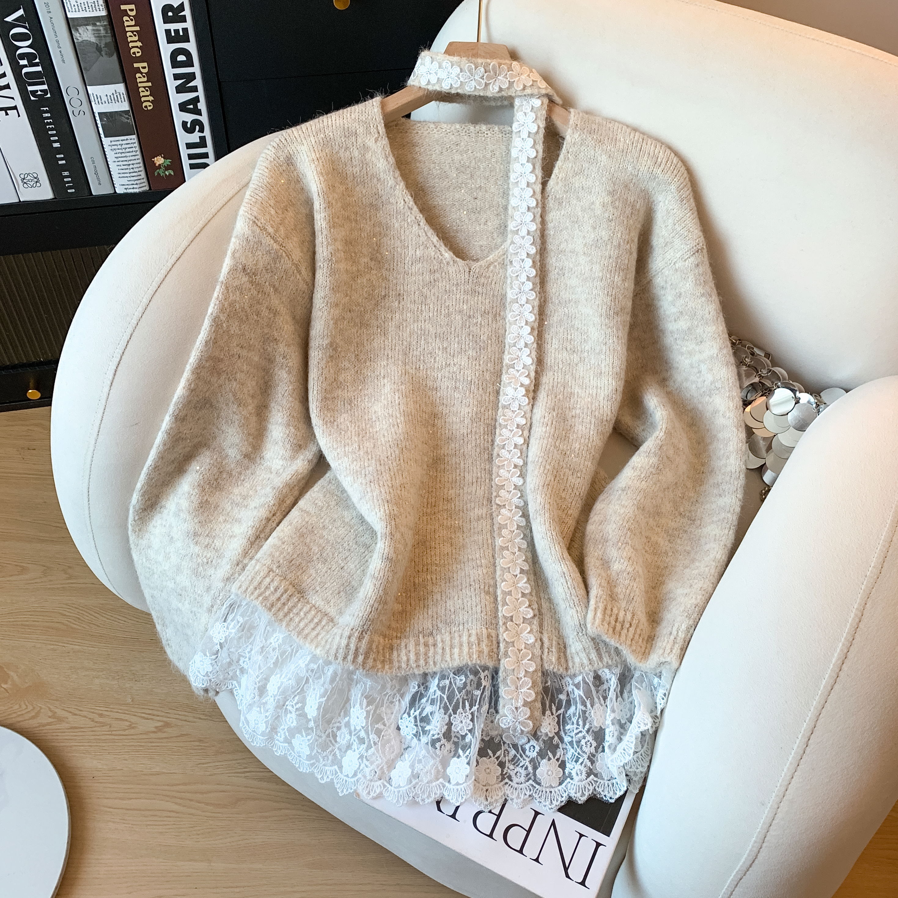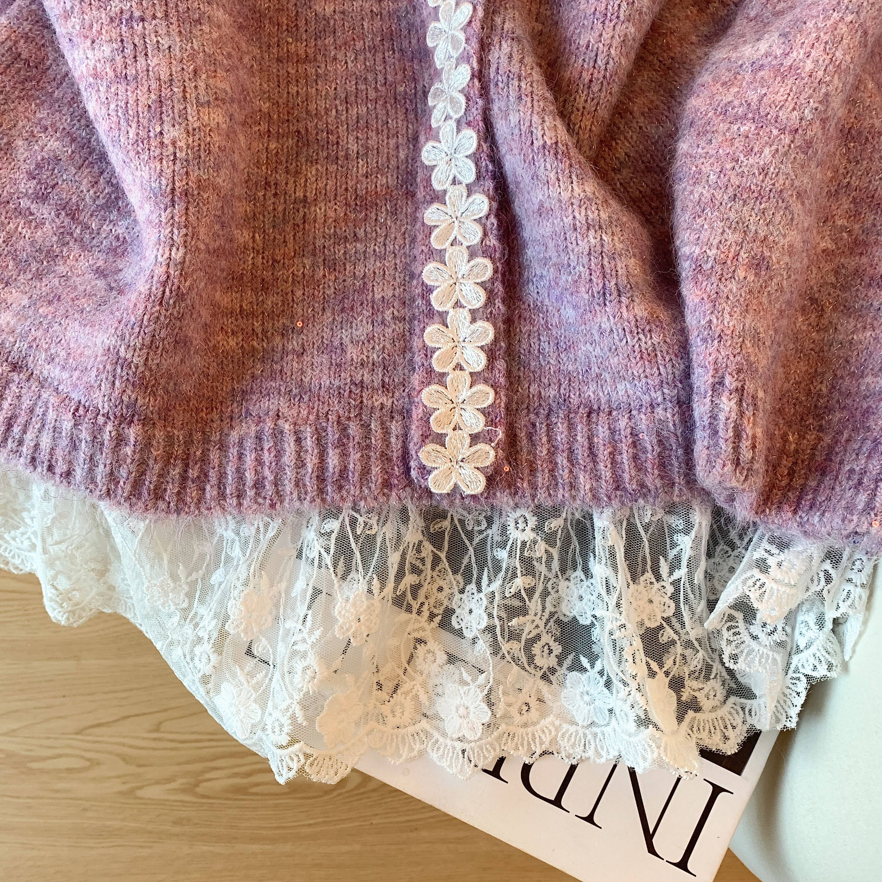 FA43444# 紫色V领法式蕾丝拼接飘带挂脖温柔风秋冬氛围感慵懒宽松上衣 服裝批發女裝批發服飾貨源