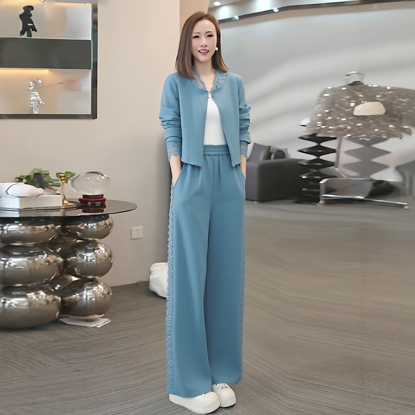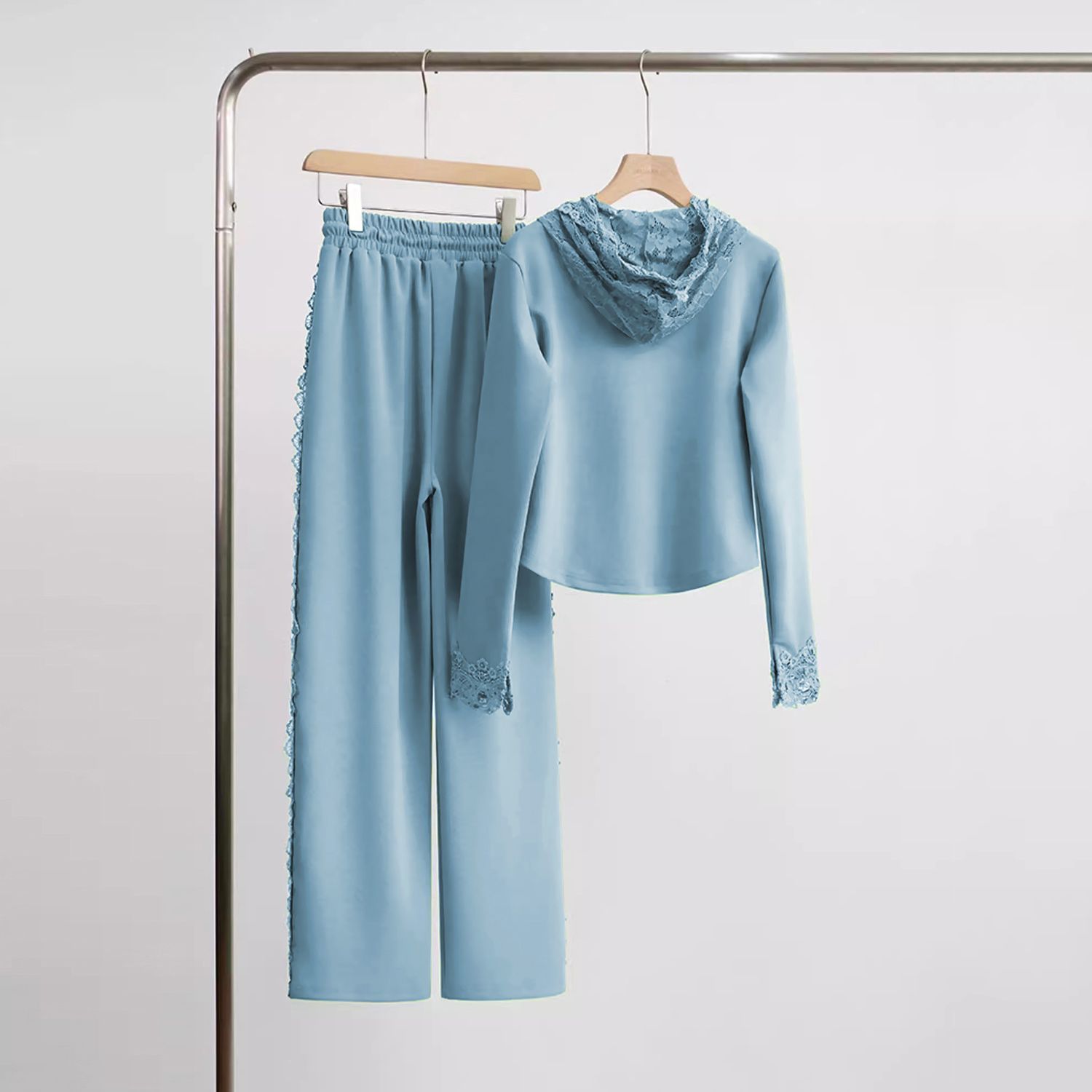FA43461# 欧货休闲运动套装女春秋新款时尚洋气连帽蕾丝拼接卫衣两件套 服裝批發女裝批發服飾貨源