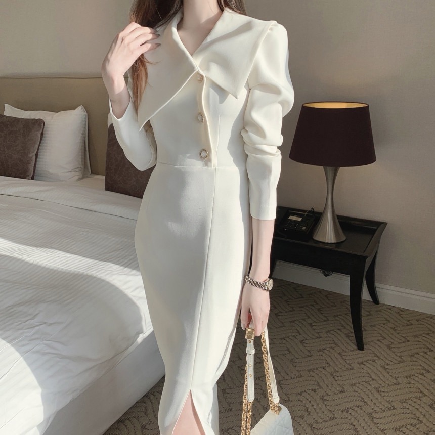 FA43474# 现货新款时尚不对称大翻领修身显瘦通勤连衣裙纯色 服裝批發女裝批發服飾貨源