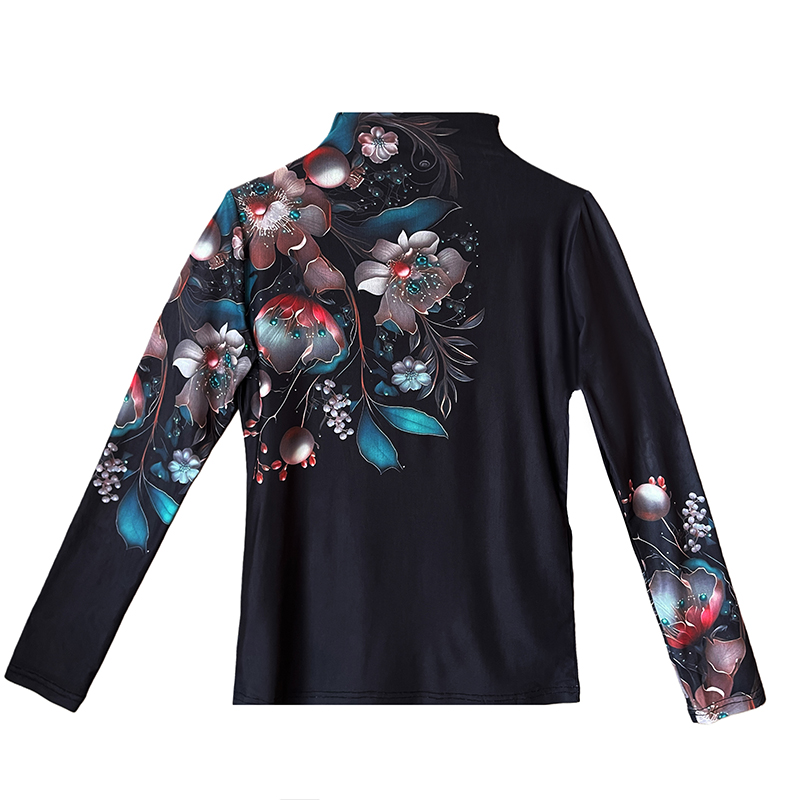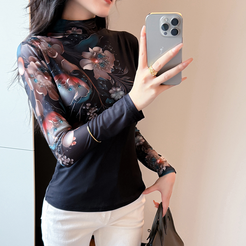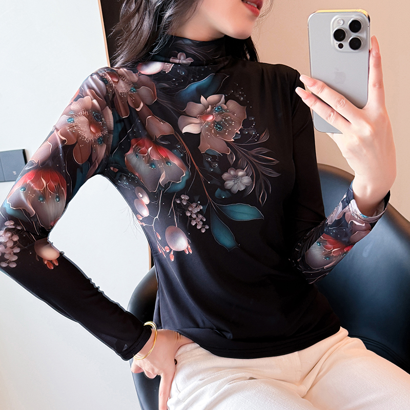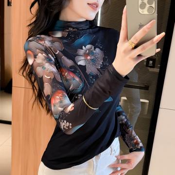 FA43496# 印花高领修身网纱长袖T恤女秋季新款时尚洋气百搭小衫通勤 服裝批發女裝批發服飾貨源