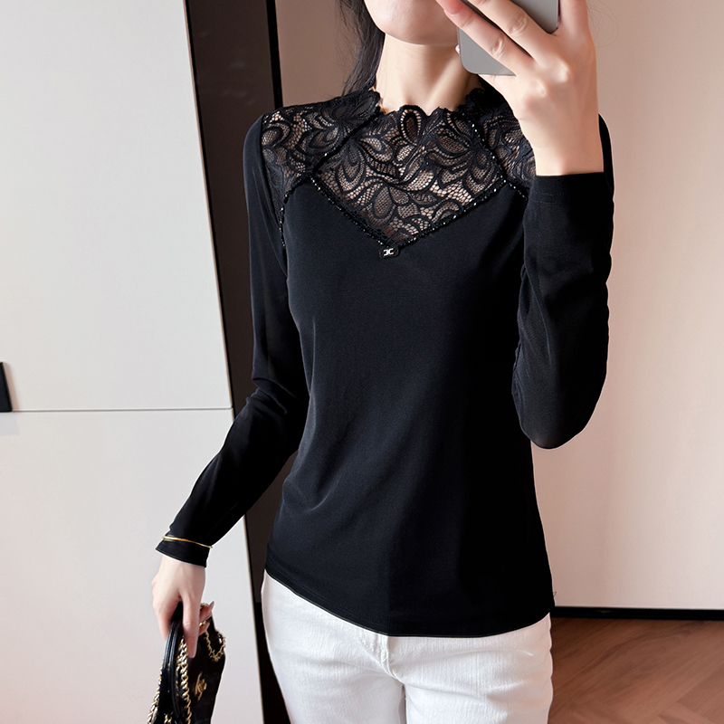 FA43497# 微透圆领花边长袖女款T恤秋季新款独特漂亮小衫纯色洋气时尚上衣 服裝批發女裝批發服飾貨源