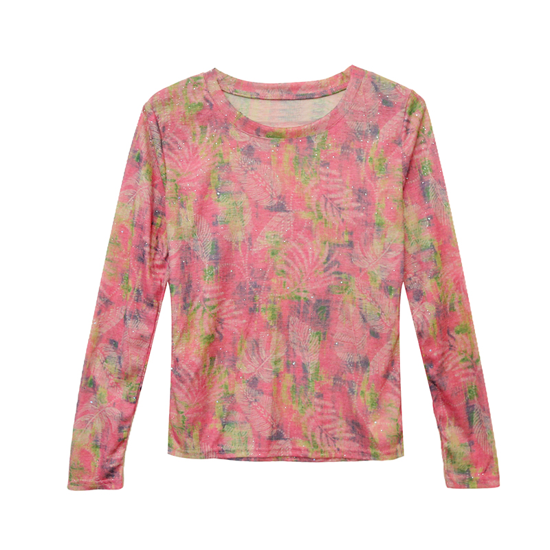 FA43505# 秋季新款圆领植物印花时尚长袖潮百搭舒适T恤洋气别致上衣 服裝批發女裝批發服飾貨源