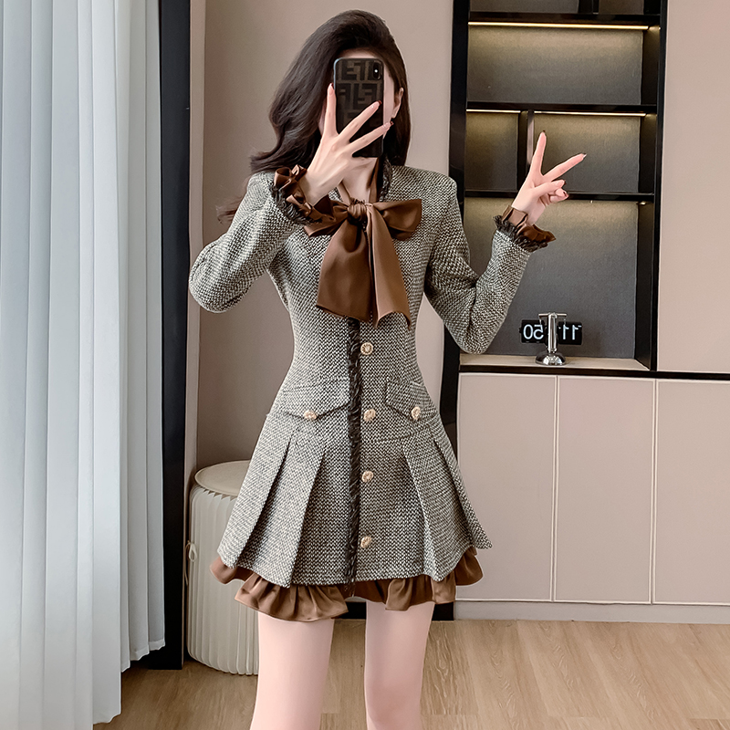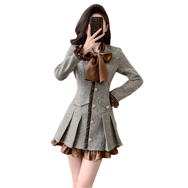 Home > 夜店裙、长袖连衣裙 > FA43510# 法式轻奢小香风连衣裙女秋冬新款拼接假两件修身显瘦粗花呢百褶裙 服裝批發女裝批發服飾貨源