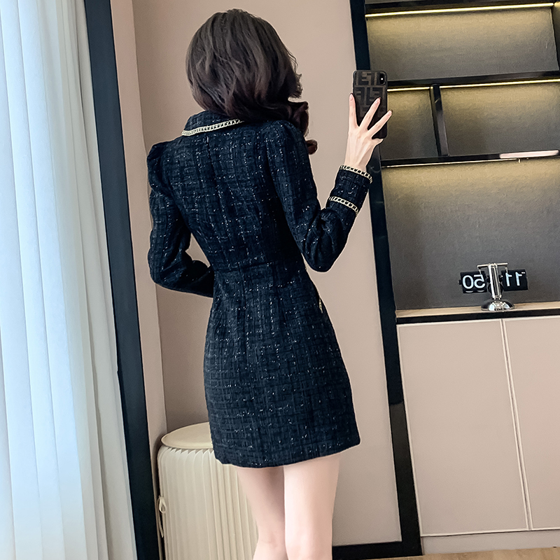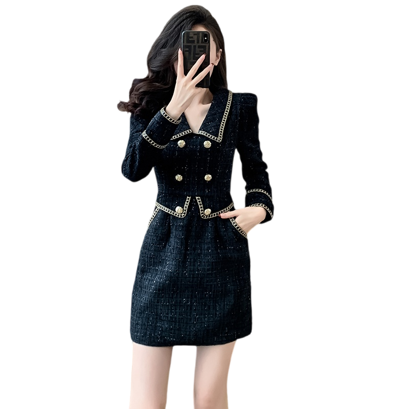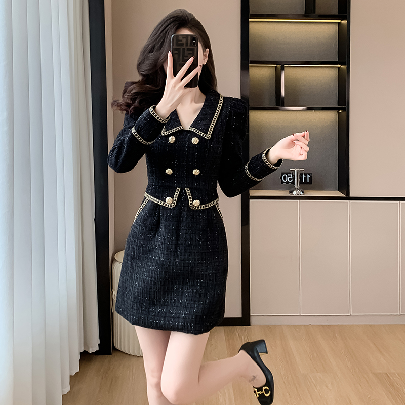 FA43511# 法式轻奢小香风黑色连衣裙女秋冬新款设计感假两件短款a字裙 服裝批發女裝批發服飾貨源