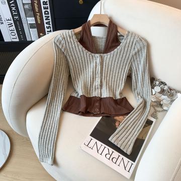 FA43544# 美式复古针织假两件长袖上衣设计感撞色挂脖短款T恤打底衫 服裝批發女裝批發服飾貨源