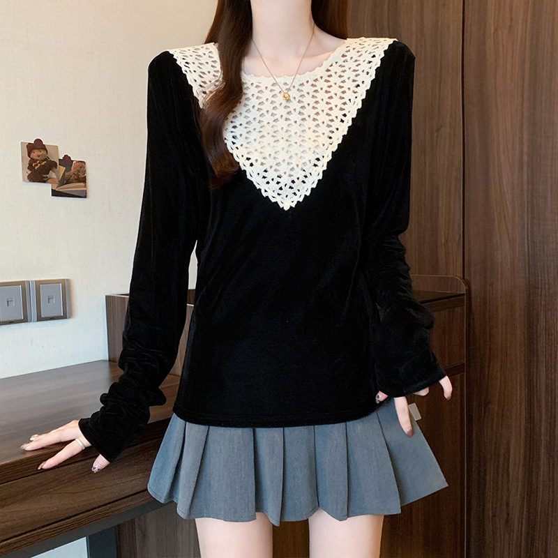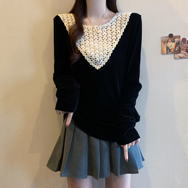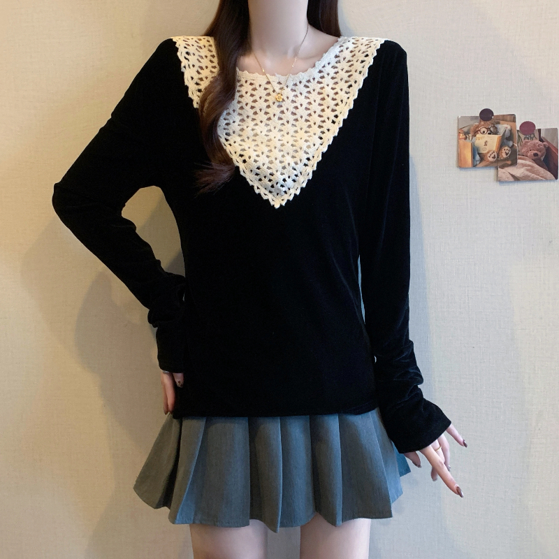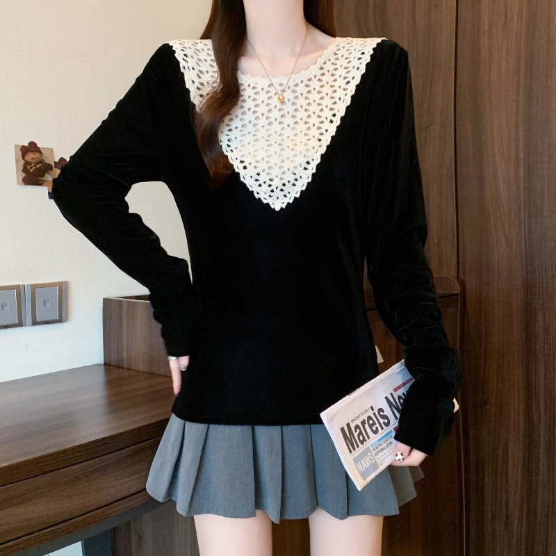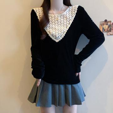 FA43565# 秋冬新款大码时尚气质百搭蕾丝拼接缕空设计丝绒T恤上衣 服裝批發女裝批發服飾貨源