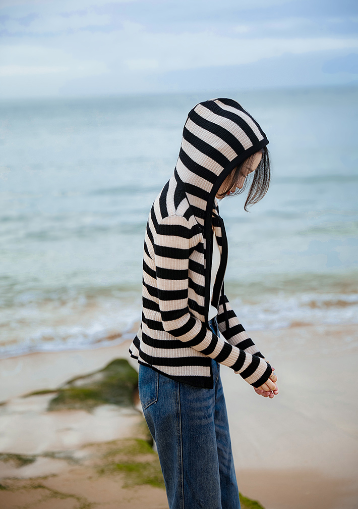 FA43610# 秋款纸片人条纹系列筋骨感肌理针织连帽开衫 服裝批發女裝批發服飾貨源