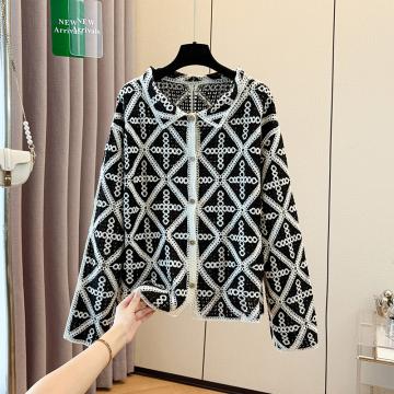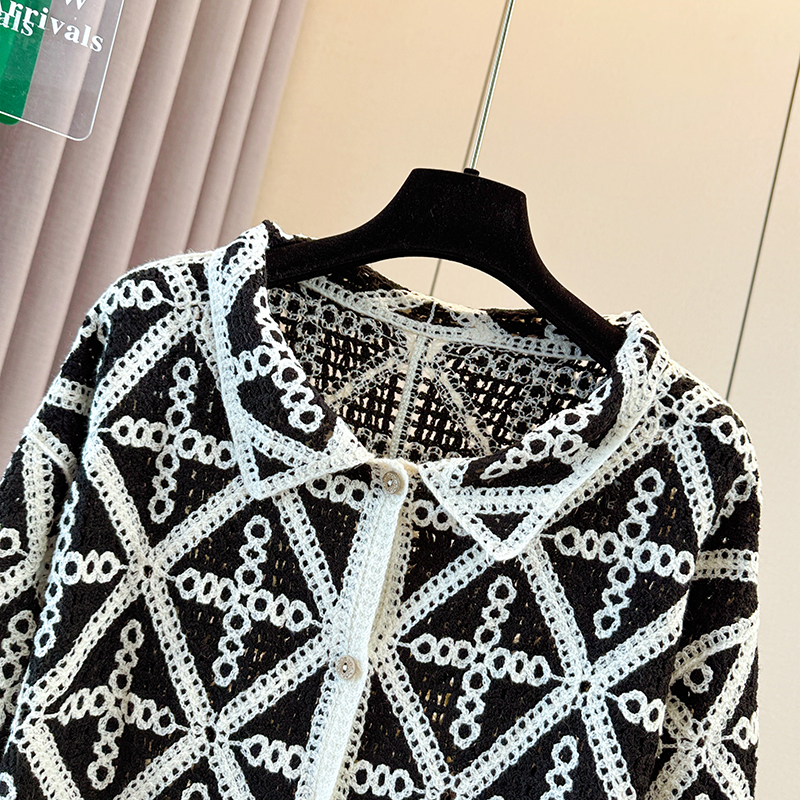 FA43620# 秋季慵懒设计感复古翻领镂空花纹开衫女钩花针织时尚撞色外套 服裝批發女裝批發服飾貨源