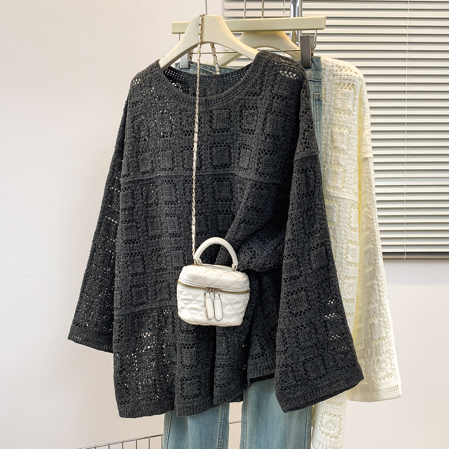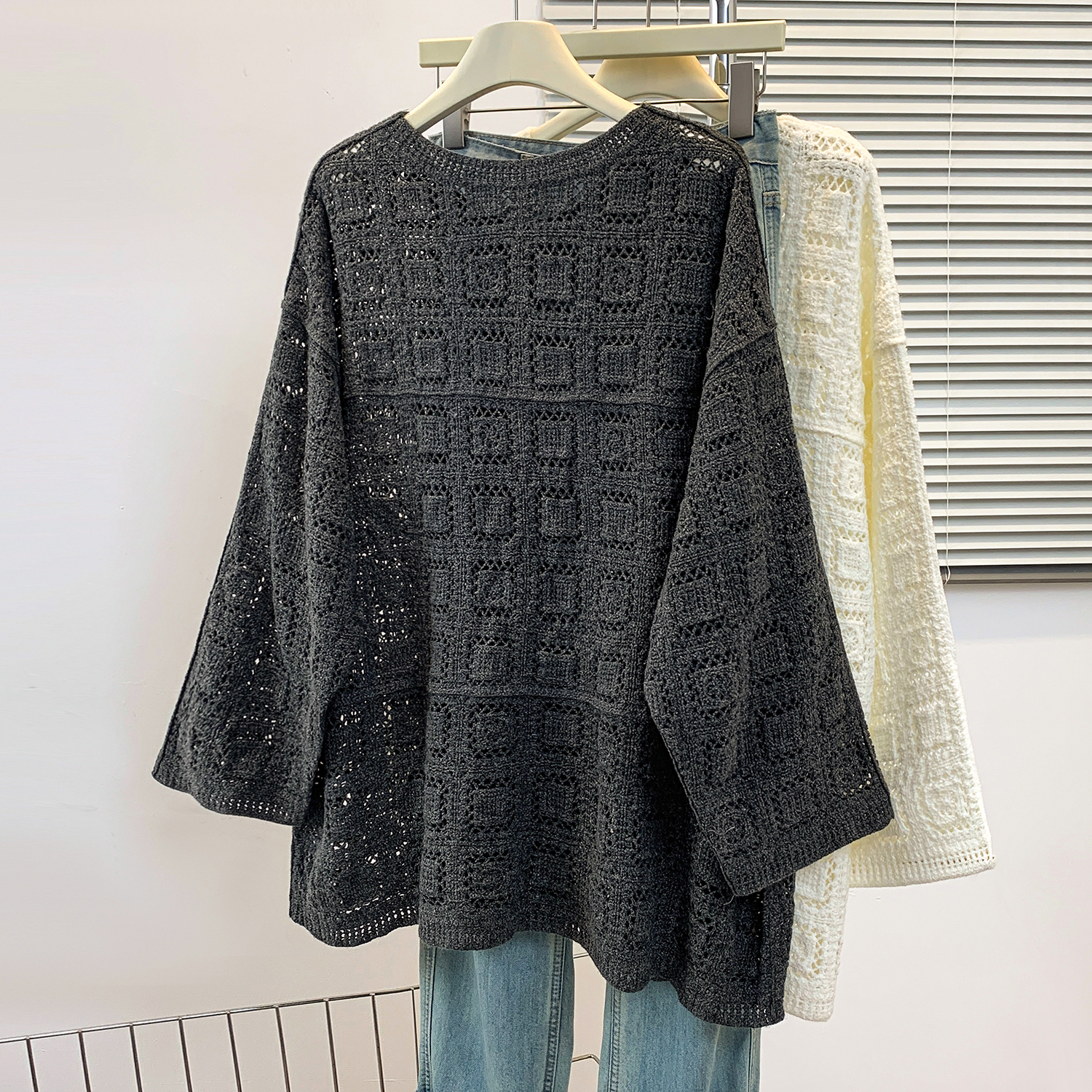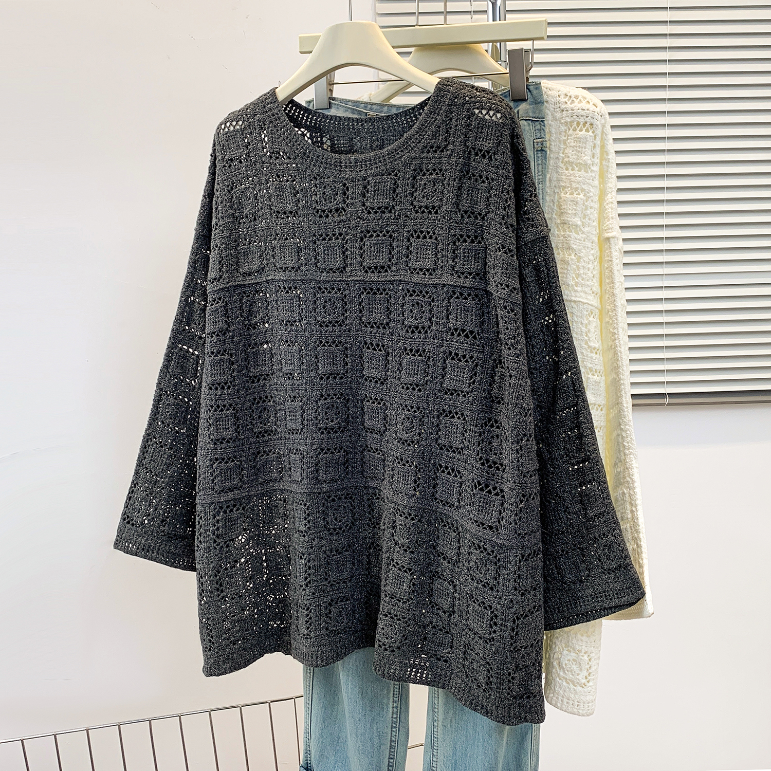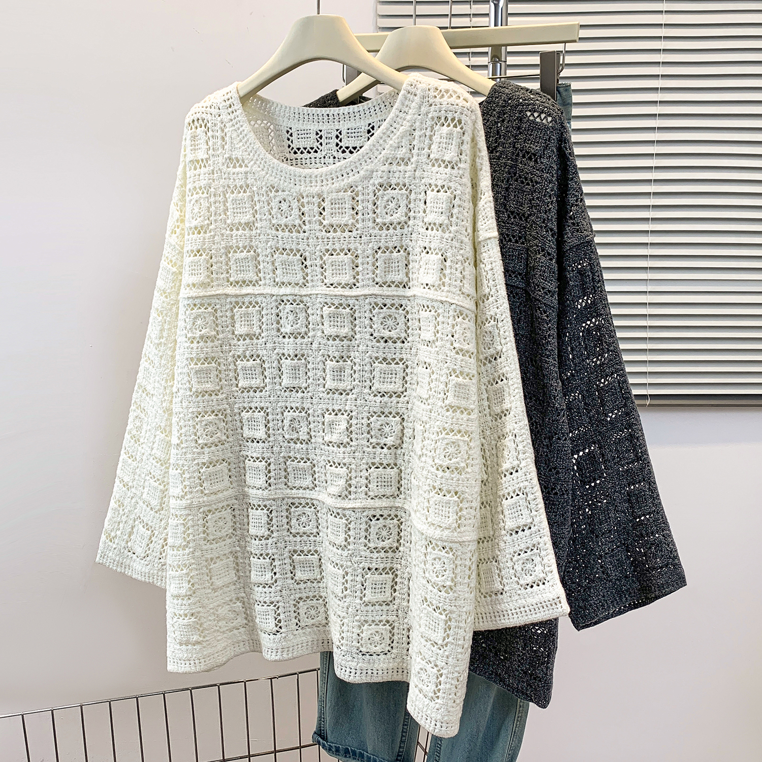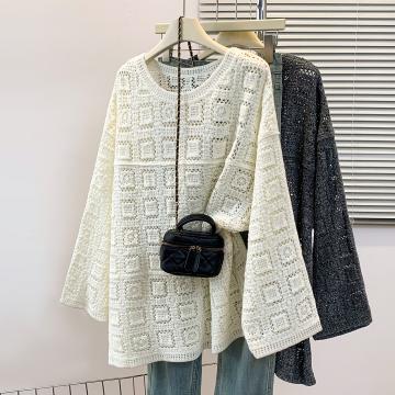 FA43621# 钩花圆领针织罩衫T恤女秋季新款宽松显瘦长袖镂空休闲上衣 服裝批發女裝批發服飾貨源